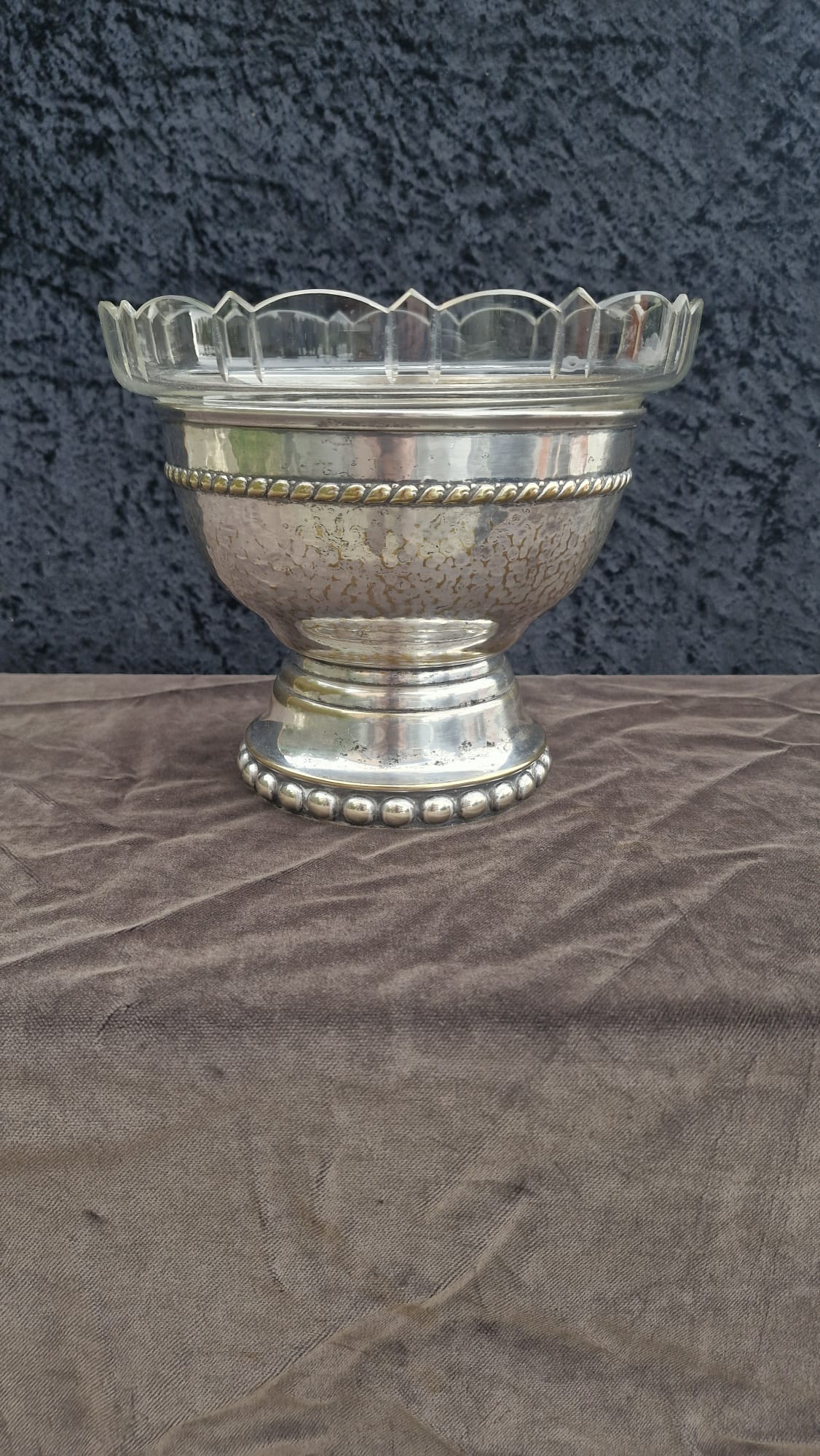 Dekorativna žardinjerica s prozirnim staklenim uloškom nazubljenog ruba, smještenim u posrebreno metalno kućište ukrašeno perlastim rubovima.