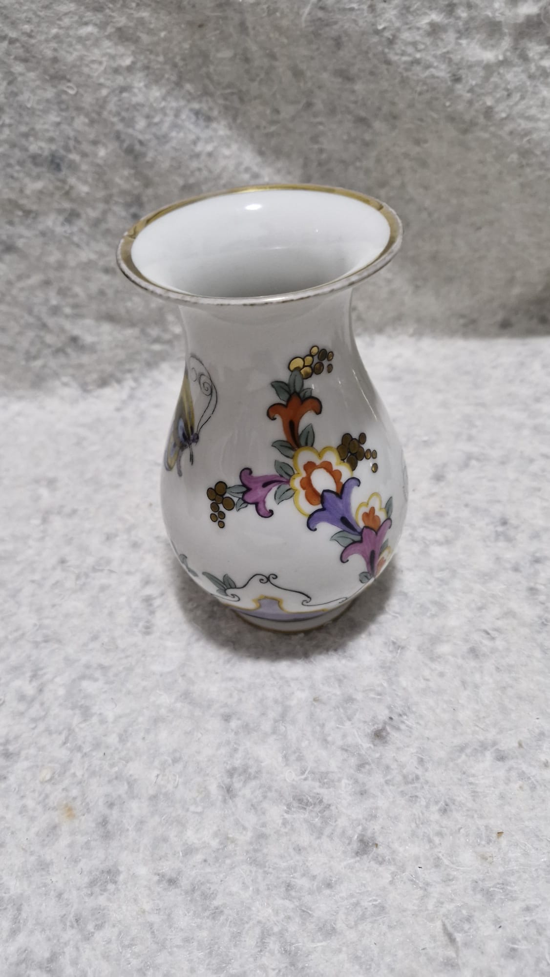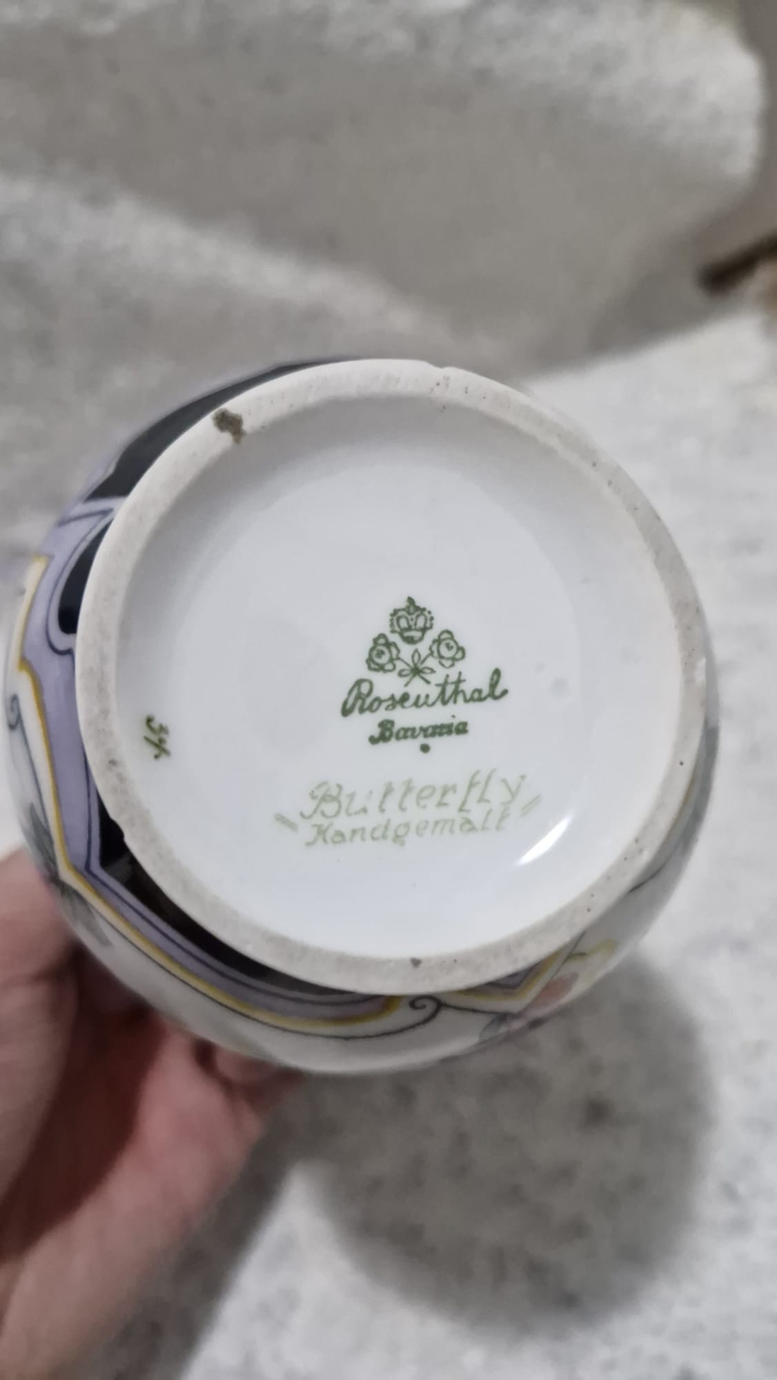 Elegantna porculanska vaza iz linije "Butterfly", ručno oslikana i potpisana "Handgemalt", proizvodnje Rosenthal Bavaria. Delikatni motivi leptira i cvijeća u pastelnim tonovima obogaćeni su zlatnim detaljima.