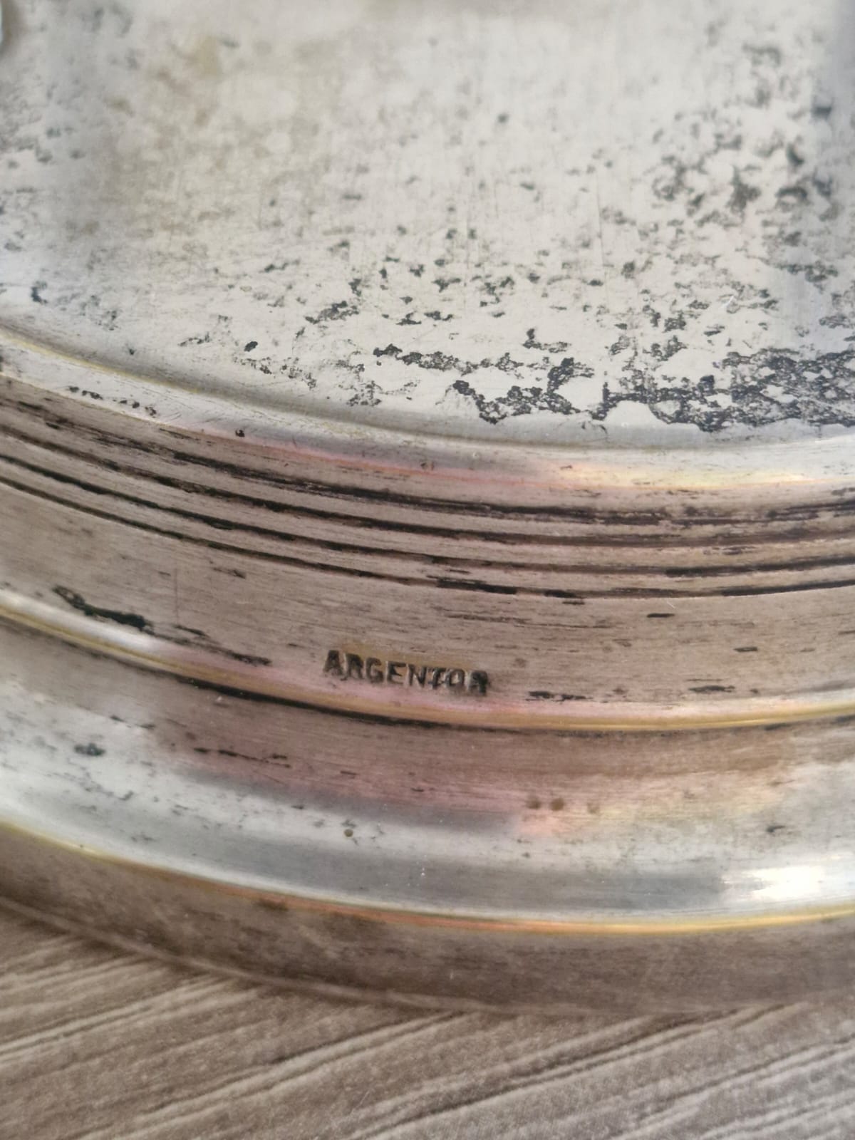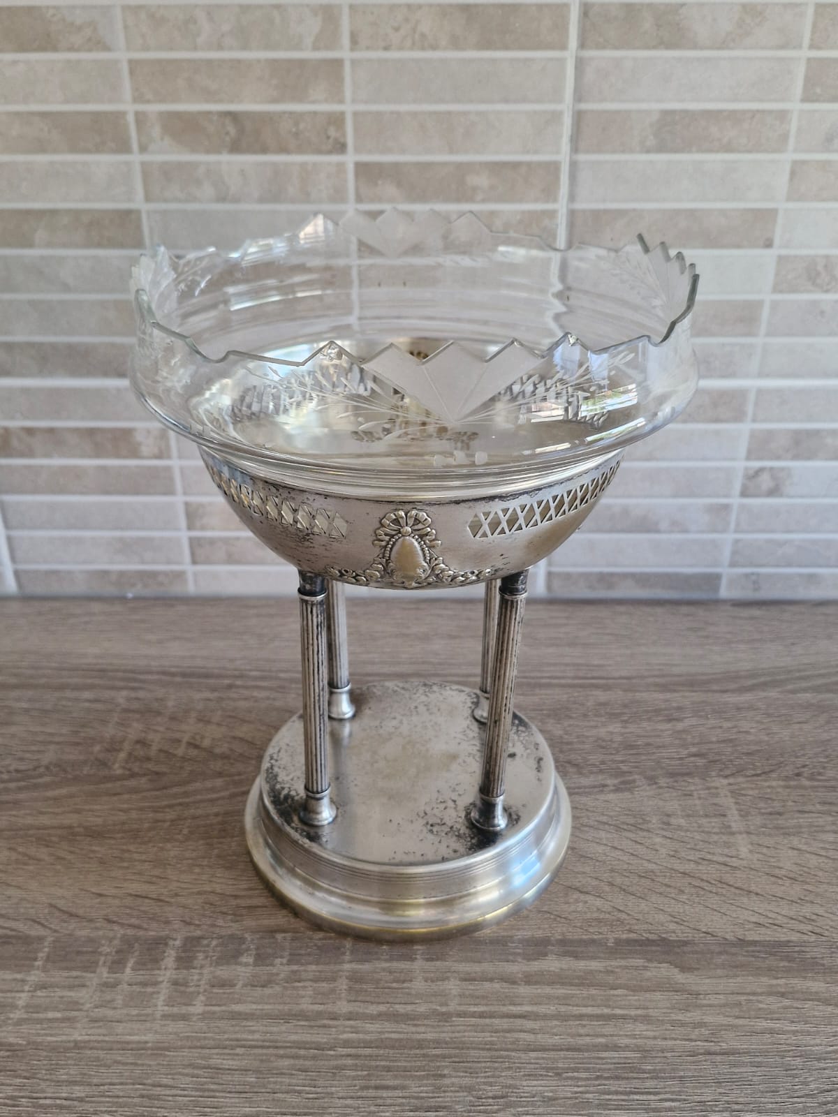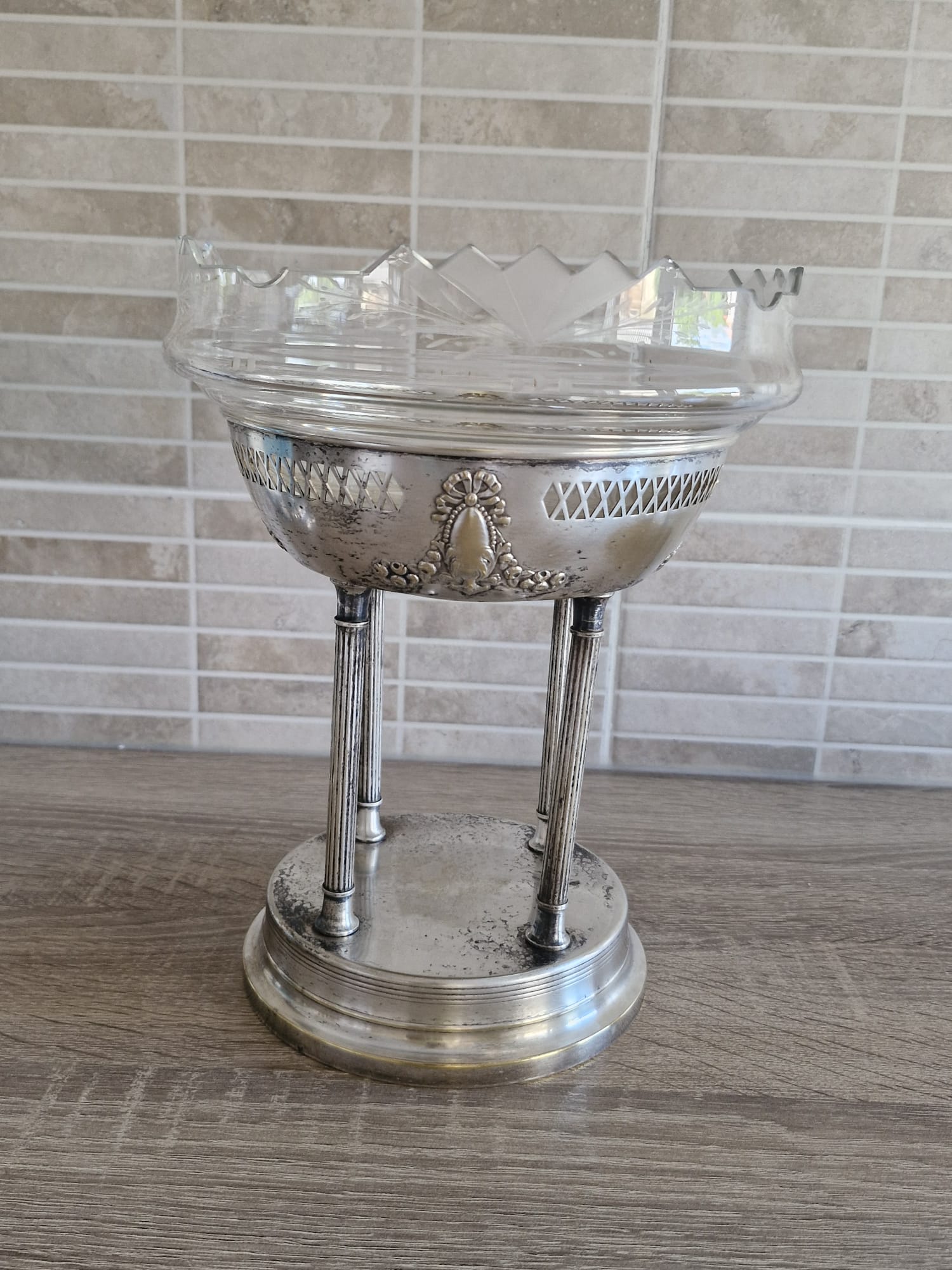 Elegantni secesijski aufsatz bečke manufakture Argentor, izrađen oko 1900. godine. Konstrukcija od posrebrenog metala s dekorativnim aplikacijama u stilu secesije nosi brušenu kristalnu zdjelu geometrijskog reza. Četiri stupića u klasicističkom stilu povezuju bazu i korpus, tvoreći skladnu i funkcionalnu cjelinu. Donji rub nosi utisnutu oznaku "ARGENTOR", prepoznatljivu za uglednu austrijsku radionicu poznatu po visokokvalitetnim dekorativnim predmetima s prijelaza iz 19. u 20. stoljeće. Komad odiše profinjenošću i povijesnim šarmom te se izvrsno uklapa u interijere s daškom bečke elegancije.