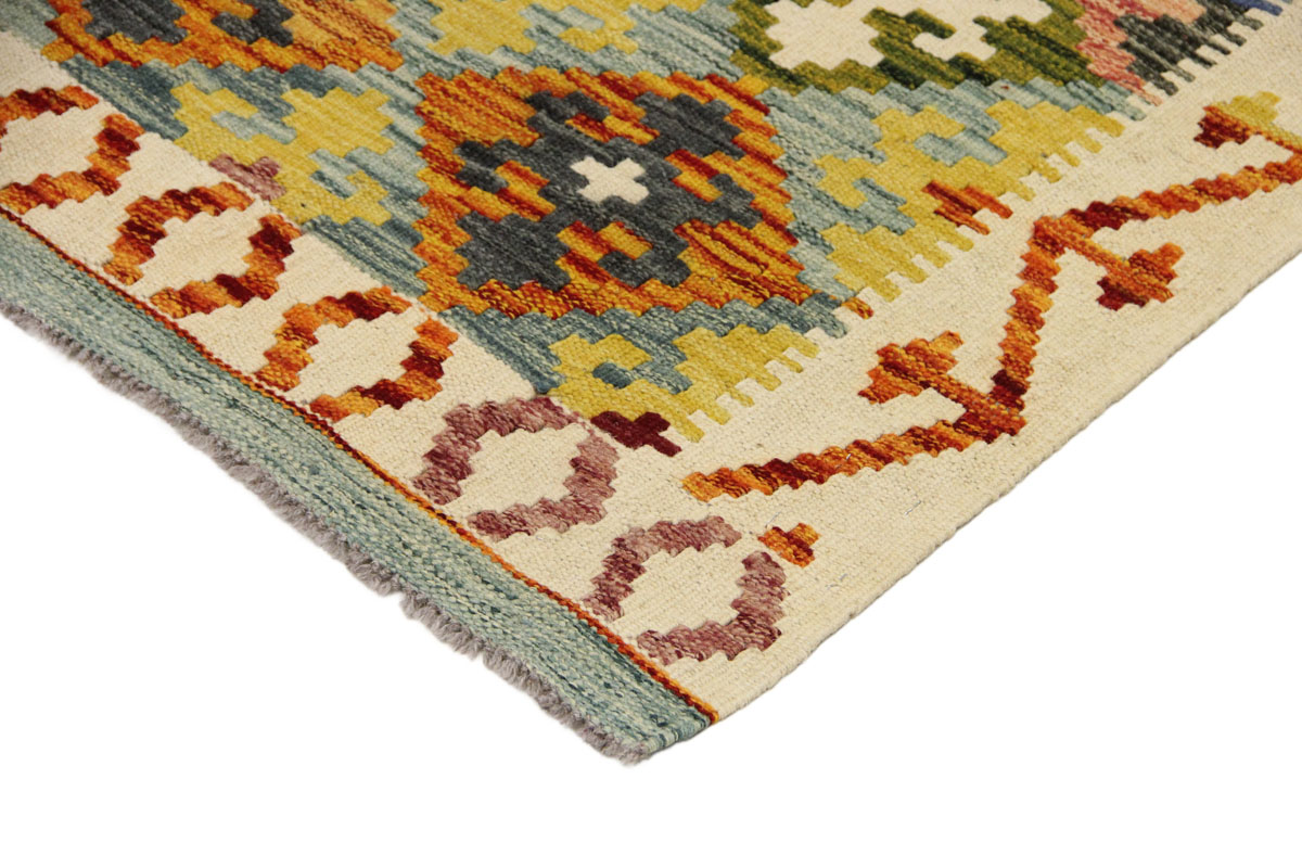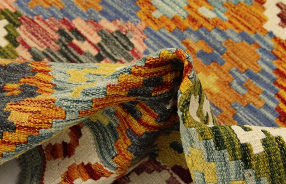 Motivi uključuju geometrijske oblike, stilizirane cvjetne elemente i povijesne ornamentalne uzorke koji su stoljećima prisutni u afganistanskoj tradiciji izrade tepiha. Zahvaljujući bogatoj ornamentici i skladnom rasporedu motiva, ovaj kelim predstavlja dekorativan element koji se lako uklapa u različite tipove interijera.