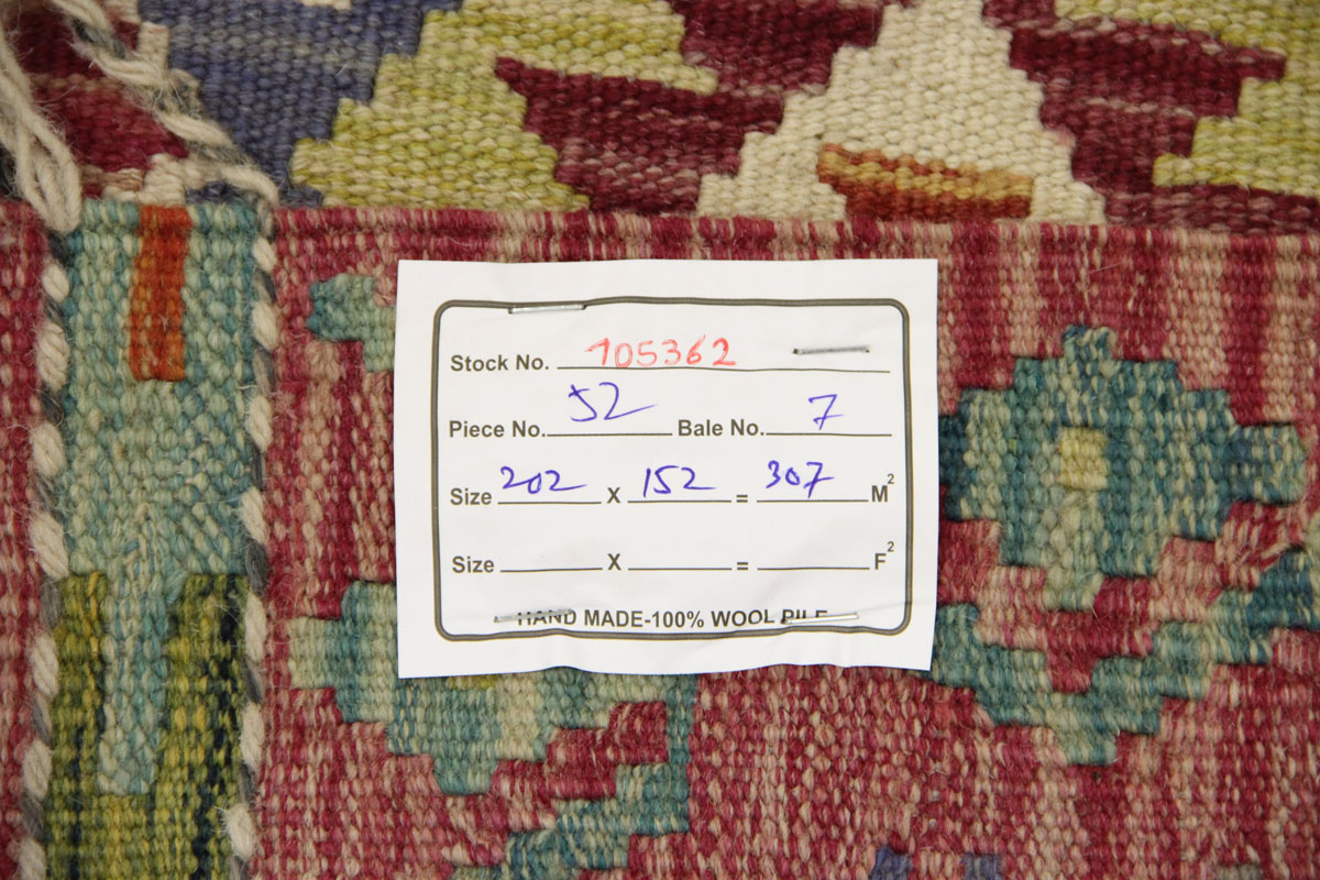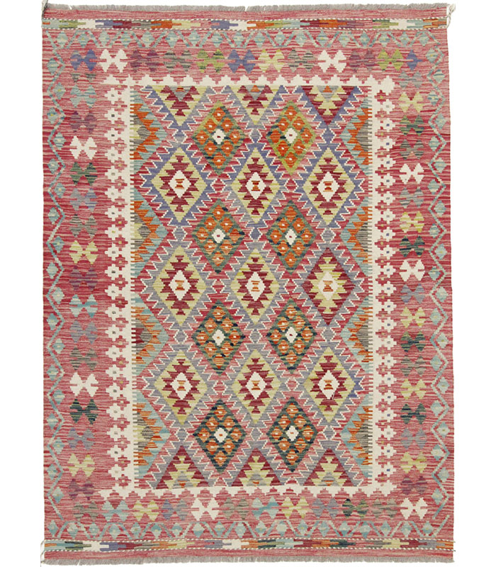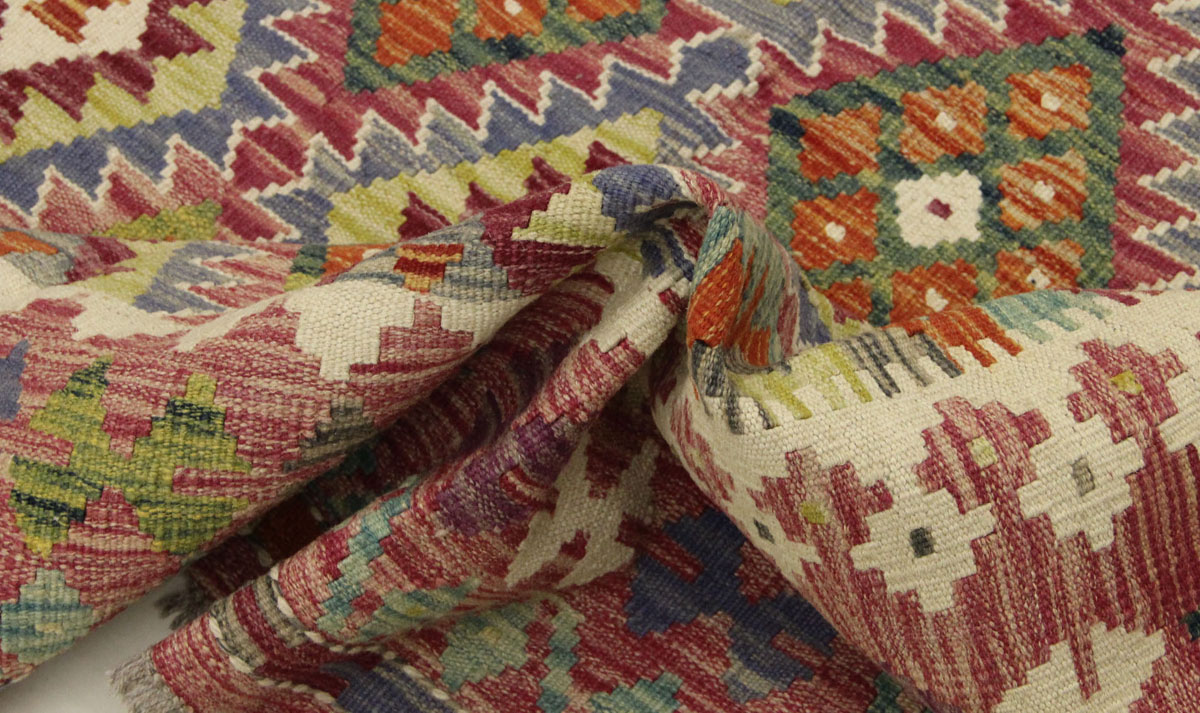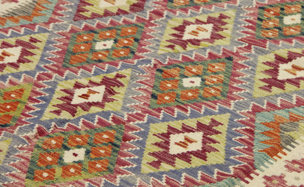 Motivi uključuju geometrijske oblike, stilizirane cvjetne elemente i povijesne ornamentalne uzorke koji su stoljećima prisutni u afganistanskoj tradiciji izrade tepiha. Zahvaljujući bogatoj ornamentici i skladnom rasporedu motiva, ovaj kelim predstavlja dekorativan element koji se lako uklapa u različite tipove interijera.