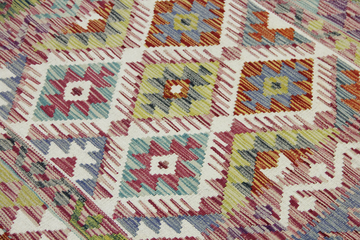 Motivi uključuju geometrijske oblike, stilizirane cvjetne elemente i povijesne ornamentalne uzorke koji su stoljećima prisutni u afganistanskoj tradiciji izrade tepiha. Zahvaljujući bogatoj ornamentici i skladnom rasporedu motiva, ovaj kelim predstavlja dekorativan element koji se lako uklapa u različite tipove interijera.