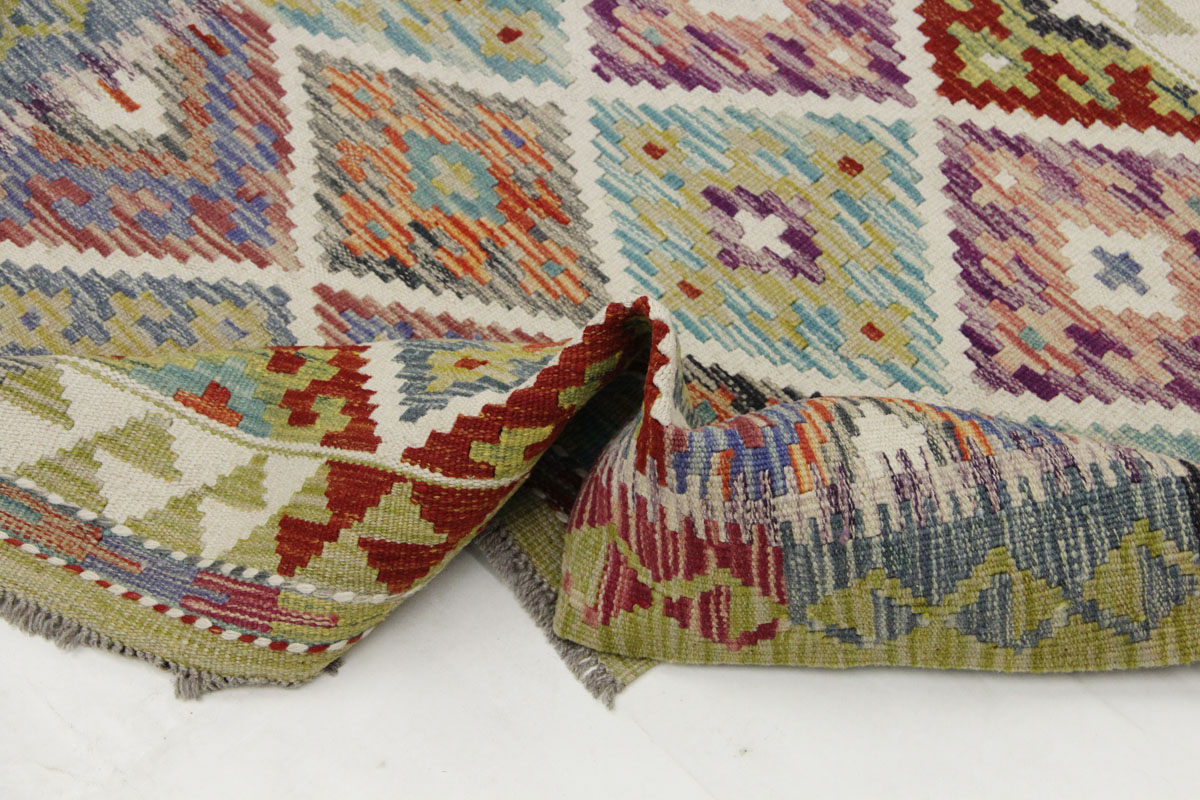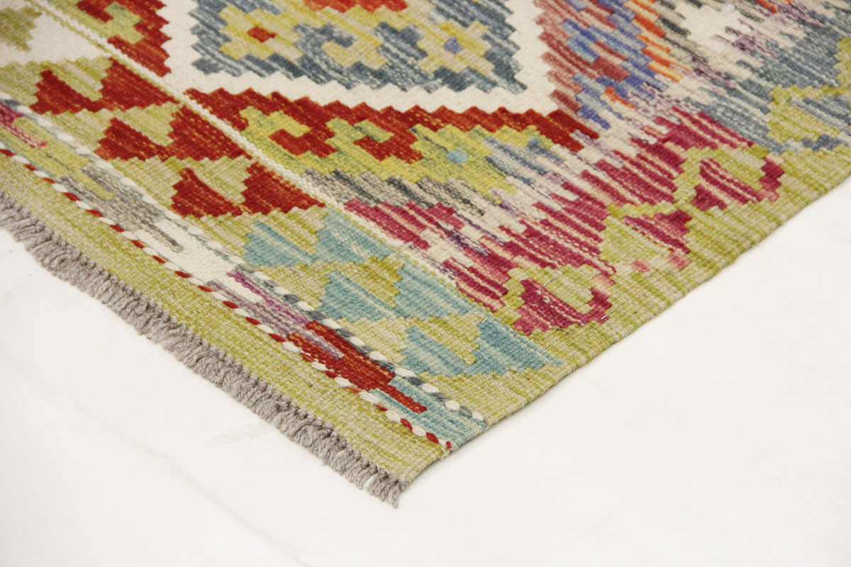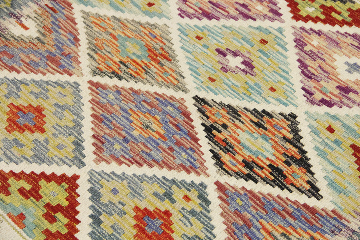 Motivi uključuju geometrijske oblike, stilizirane cvjetne elemente i povijesne ornamentalne uzorke koji su stoljećima prisutni u afganistanskoj tradiciji izrade tepiha. Zahvaljujući bogatoj ornamentici i skladnom rasporedu motiva, ovaj kelim predstavlja dekorativan element koji se lako uklapa u različite tipove interijera.