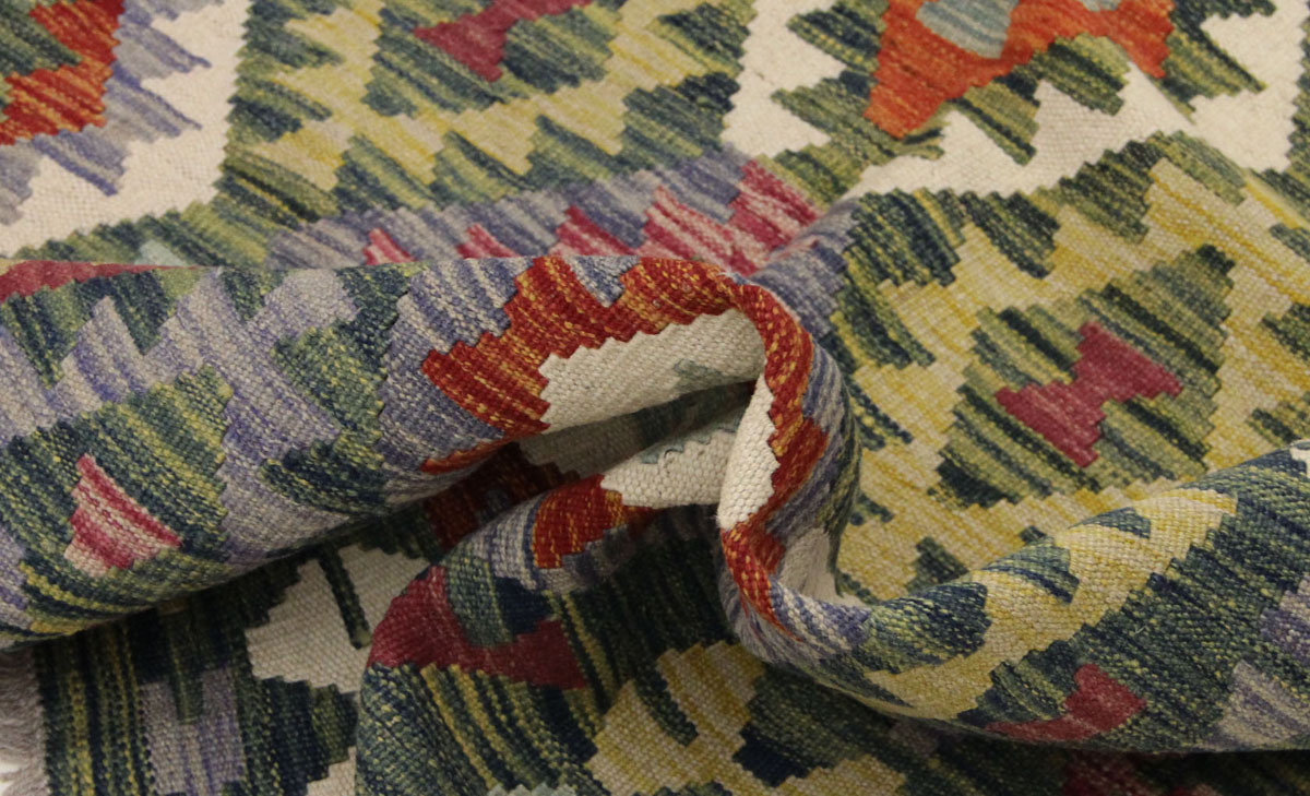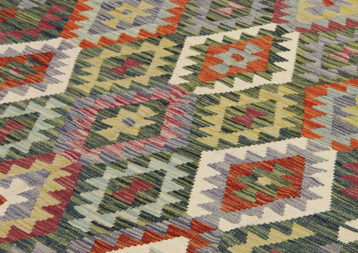 Motivi uključuju geometrijske oblike, stilizirane cvjetne elemente i povijesne ornamentalne uzorke koji su stoljećima prisutni u afganistanskoj tradiciji izrade tepiha. Zahvaljujući bogatoj ornamentici i skladnom rasporedu motiva, ovaj kelim predstavlja dekorativan element koji se lako uklapa u različite tipove interijera.