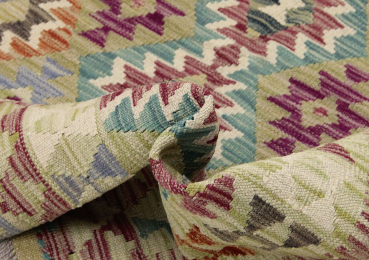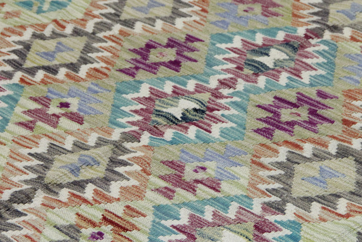 Motivi uključuju geometrijske oblike, stilizirane cvjetne elemente i povijesne ornamentalne uzorke koji su stoljećima prisutni u afganistanskoj tradiciji izrade tepiha. Zahvaljujući bogatoj ornamentici i skladnom rasporedu motiva, ovaj kelim predstavlja dekorativan element koji se lako uklapa u različite tipove interijera.
