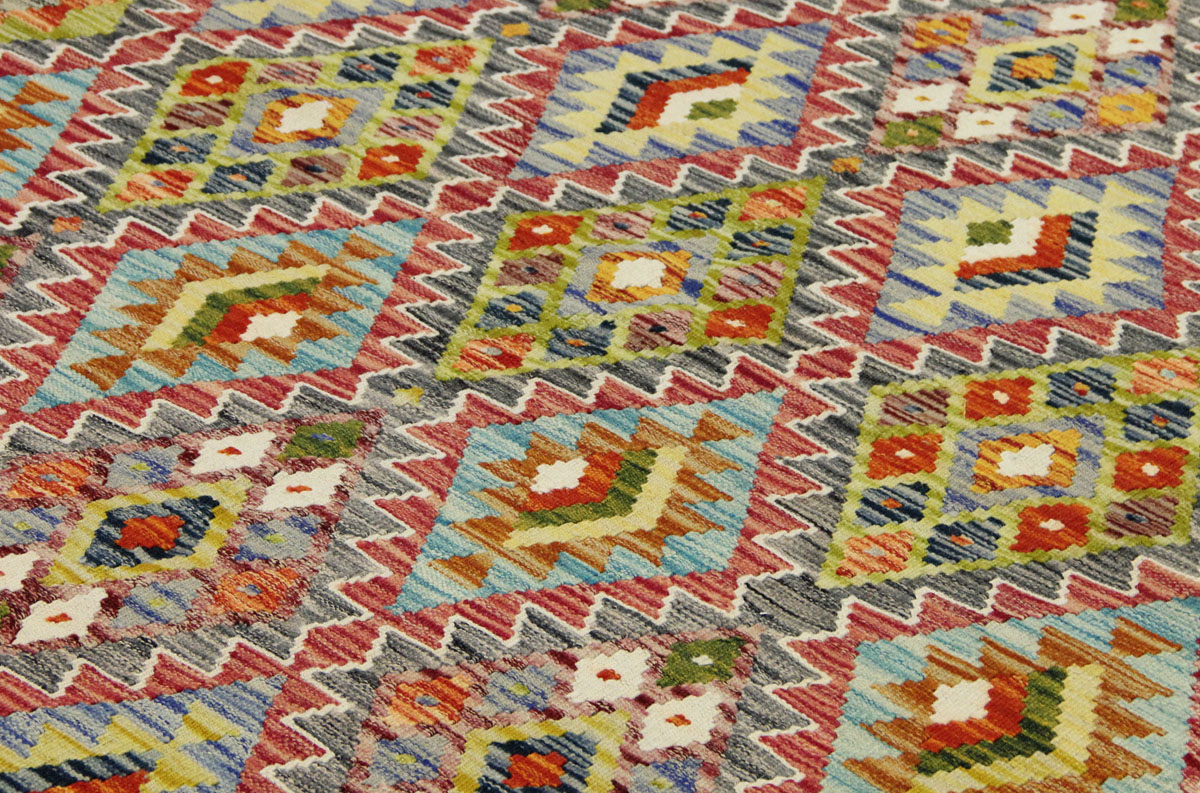 Motivi uključuju geometrijske oblike, stilizirane cvjetne elemente i povijesne ornamentalne uzorke koji su stoljećima prisutni u afganistanskoj tradiciji izrade tepiha. Zahvaljujući bogatoj ornamentici i skladnom rasporedu motiva, ovaj kelim predstavlja dekorativan element koji se lako uklapa u različite tipove interijera.