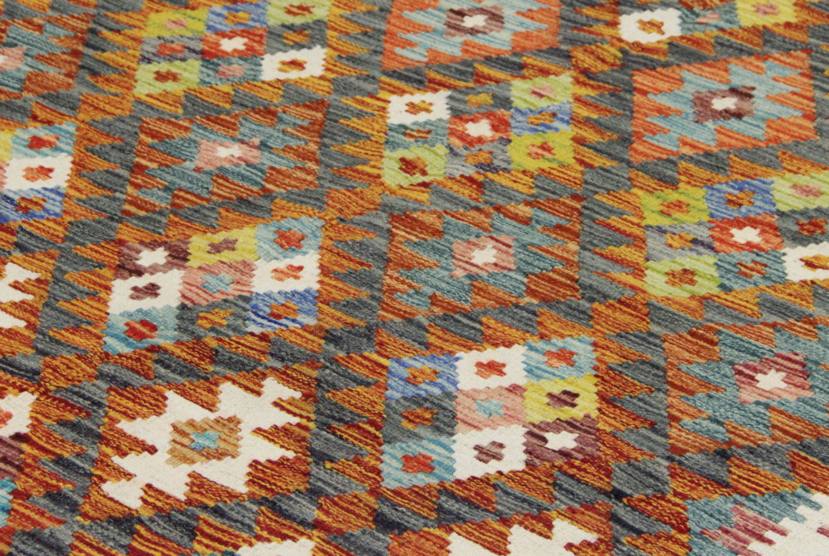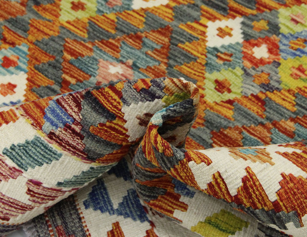 Motivi uključuju geometrijske oblike, stilizirane cvjetne elemente i povijesne ornamentalne uzorke koji su stoljećima prisutni u afganistanskoj tradiciji izrade tepiha. Zahvaljujući bogatoj ornamentici i skladnom rasporedu motiva, ovaj kelim predstavlja dekorativan element koji se lako uklapa u različite tipove interijera.