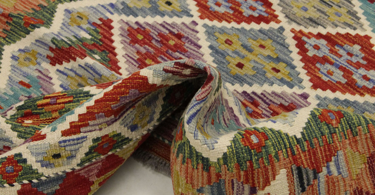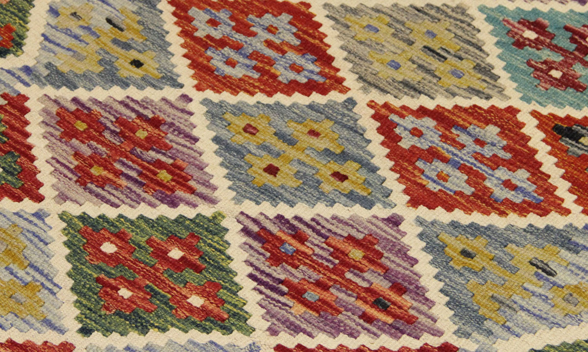 Motivi uključuju geometrijske oblike, stilizirane cvjetne elemente i povijesne ornamentalne uzorke koji su stoljećima prisutni u afganistanskoj tradiciji izrade tepiha. Zahvaljujući bogatoj ornamentici i skladnom rasporedu motiva, ovaj kelim predstavlja dekorativan element koji se lako uklapa u različite tipove interijera.