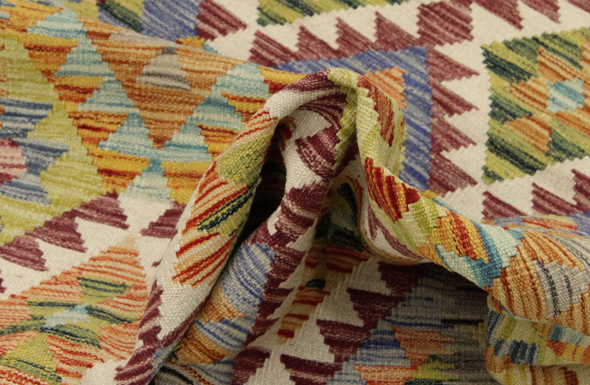 Motivi uključuju geometrijske oblike, stilizirane cvjetne elemente i povijesne ornamentalne uzorke koji su stoljećima prisutni u afganistanskoj tradiciji izrade tepiha. Zahvaljujući bogatoj ornamentici i skladnom rasporedu motiva, ovaj kelim predstavlja dekorativan element koji se lako uklapa u različite tipove interijera.
