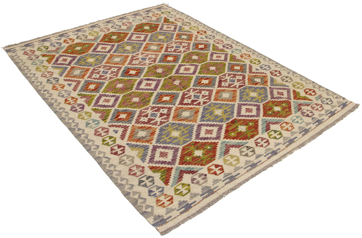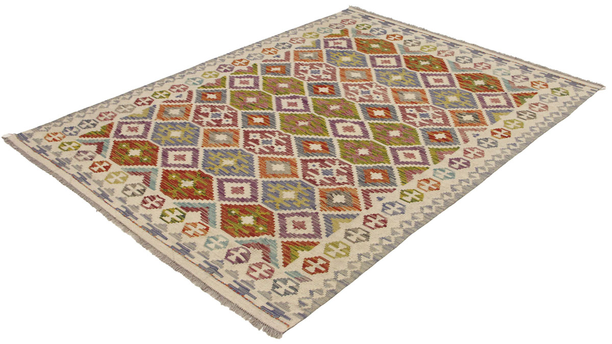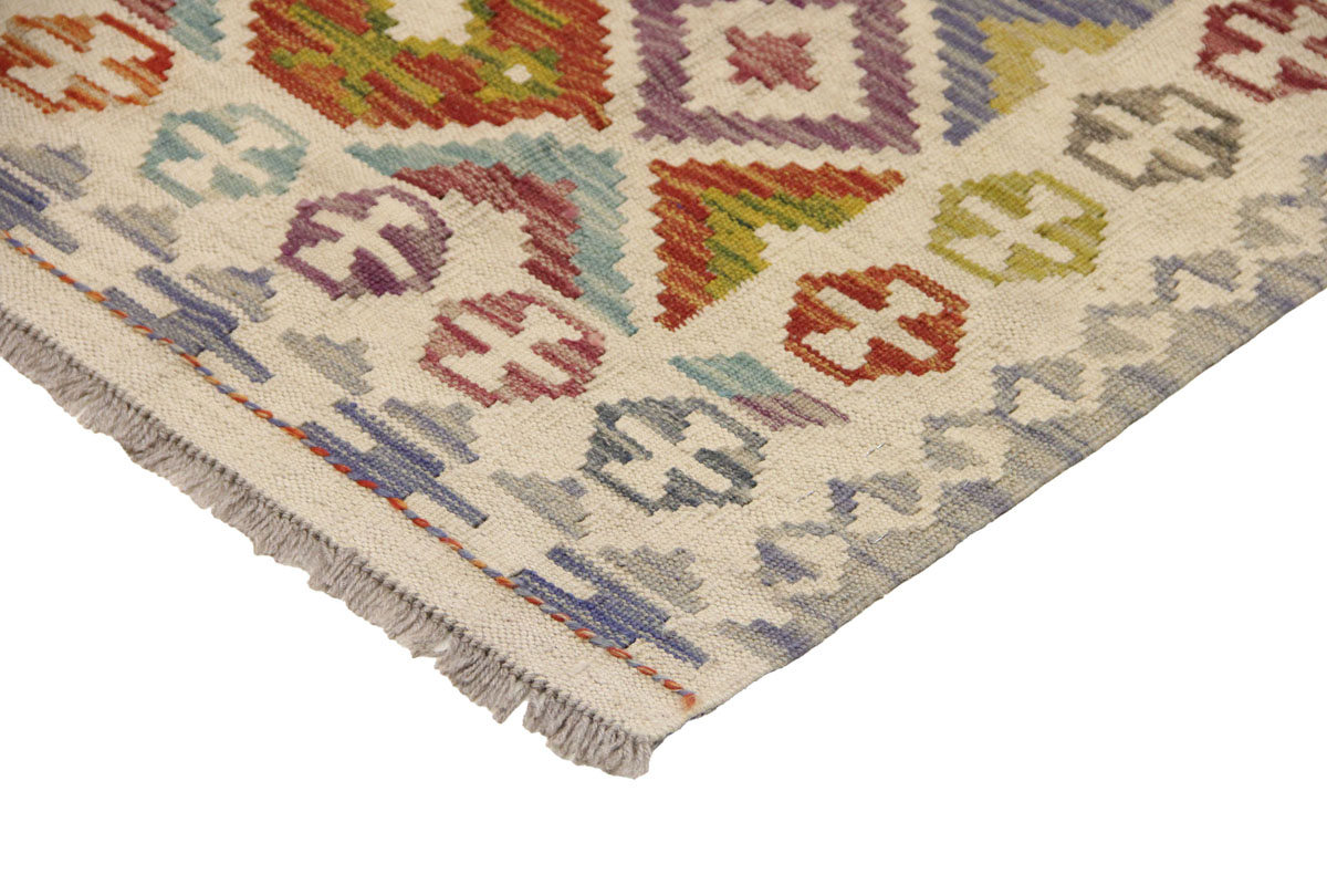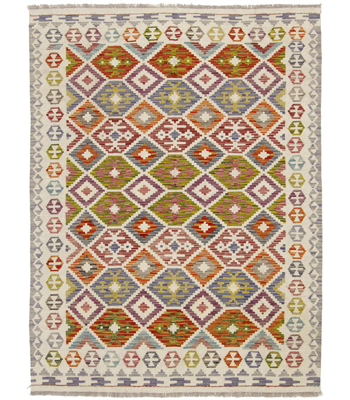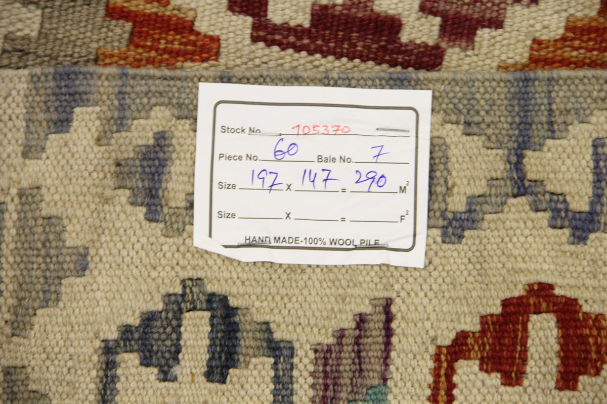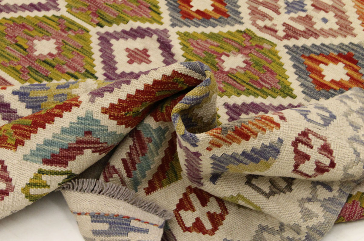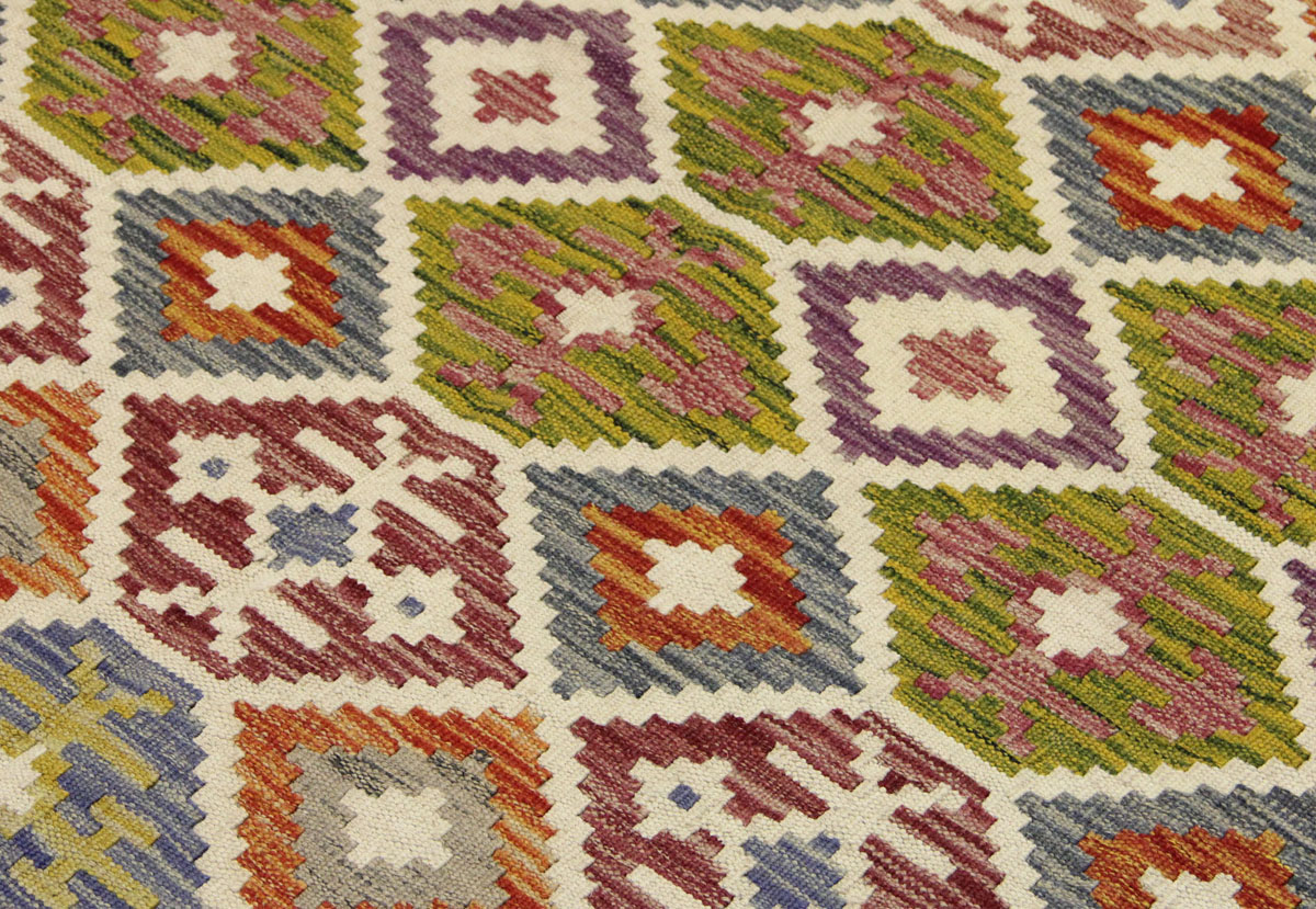 Motivi uključuju geometrijske elemente, stilizirane cvjetne oblike i povijesne ornamentalne uzorke koji su stoljećima prisutni u afganistanskoj tradiciji izrade tepiha. Zahvaljujući skladnoj kompoziciji motiva, kelim djeluje dekorativno i lako se uklapa u različite interijere – od klasičnih i etno prostora do suvremenih ambijenata.