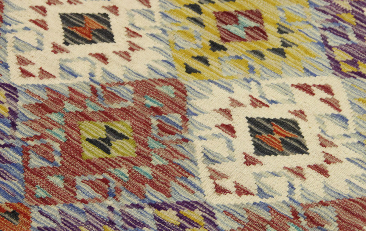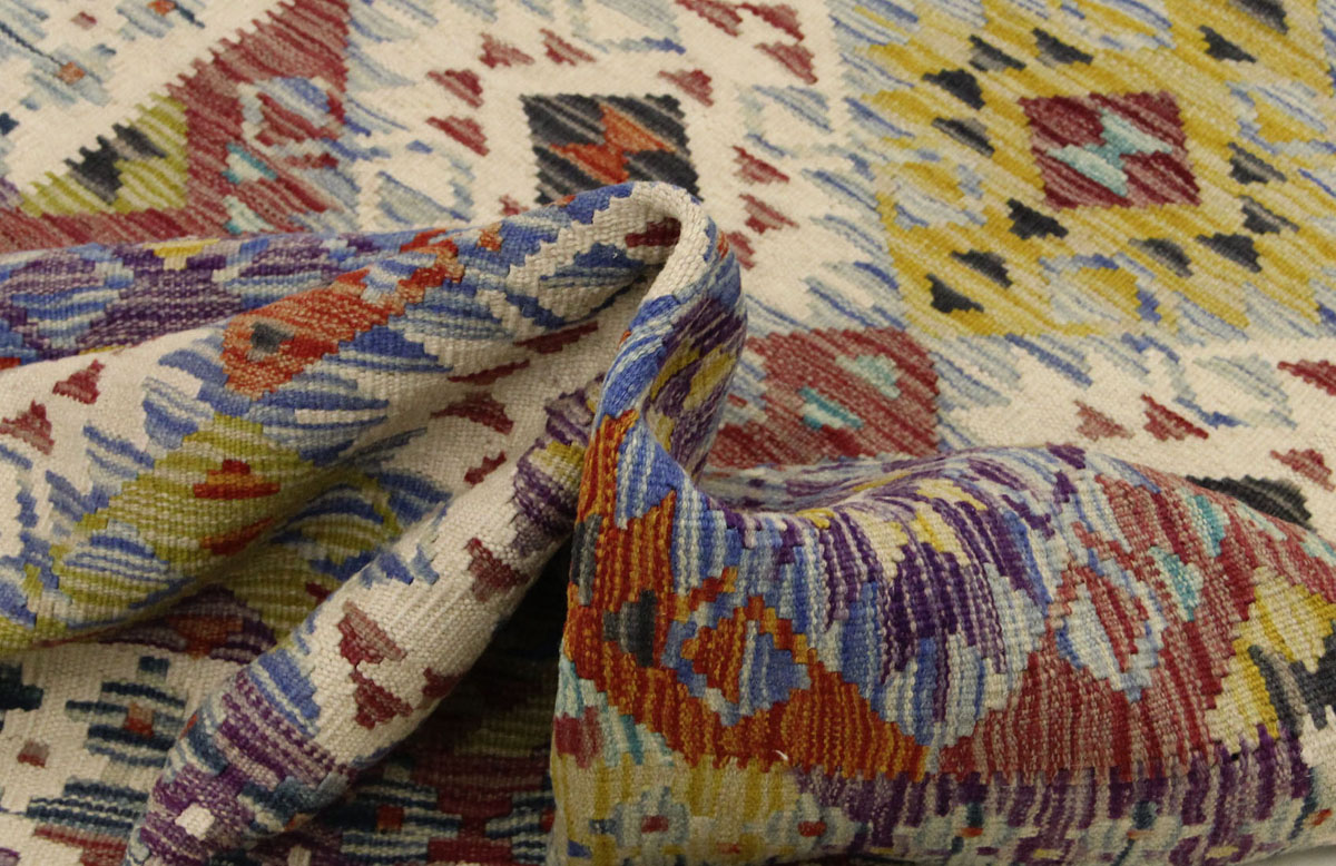 Motivi uključuju geometrijske oblike, stilizirane cvjetne elemente i povijesne ornamentalne uzorke koji su stoljećima prisutni u afganistanskoj tradiciji izrade tepiha. Zahvaljujući bogatoj ornamentici i skladnom rasporedu motiva, ovaj kelim predstavlja dekorativan element koji se lako uklapa u različite tipove interijera.