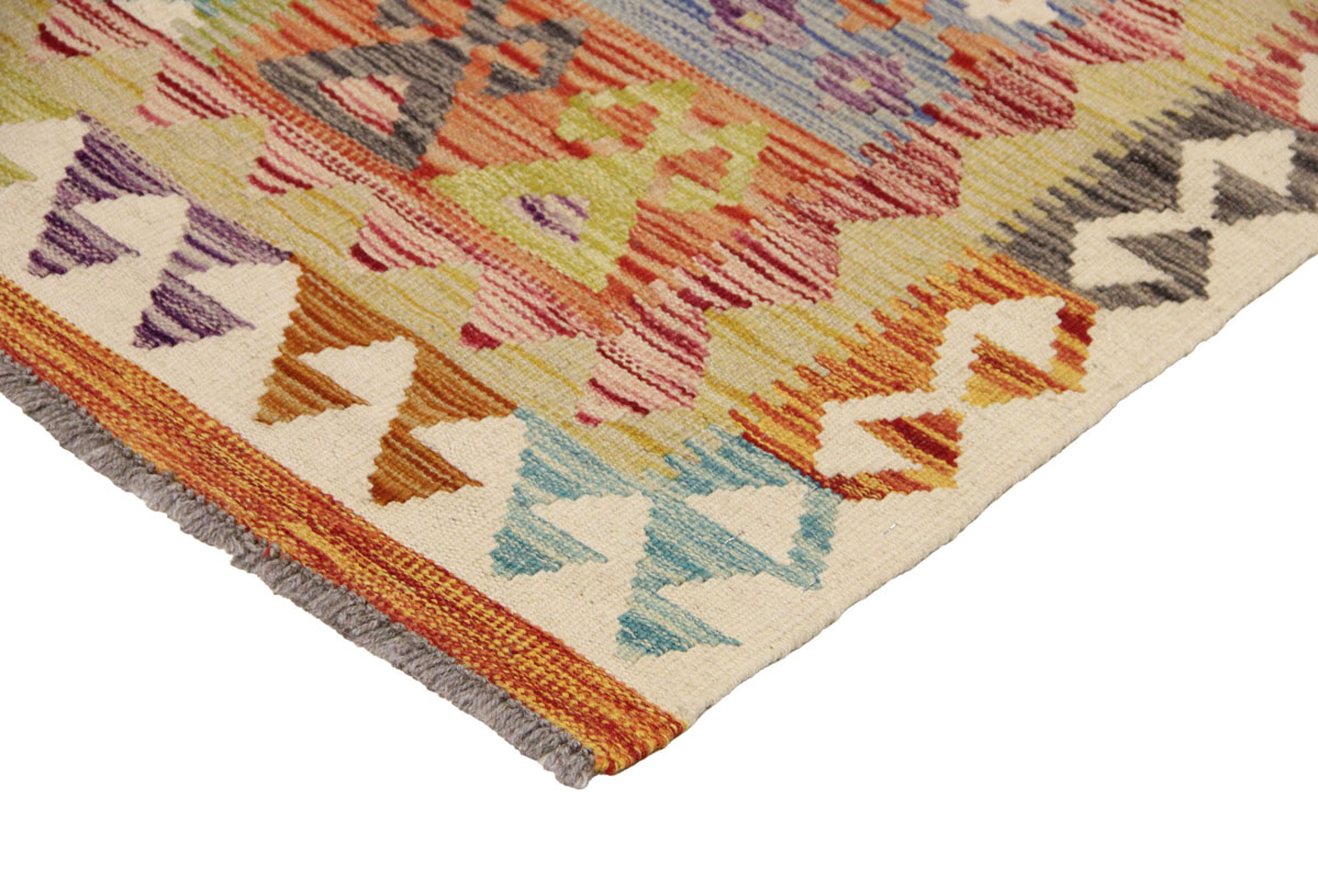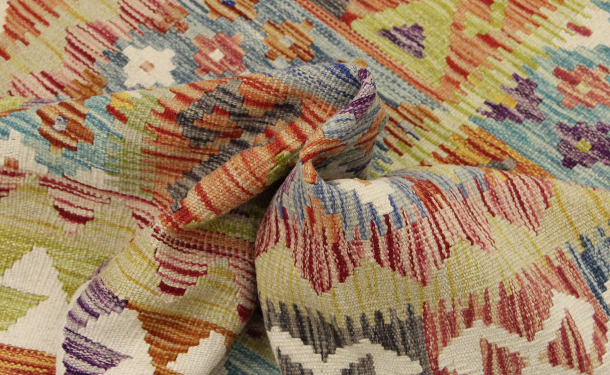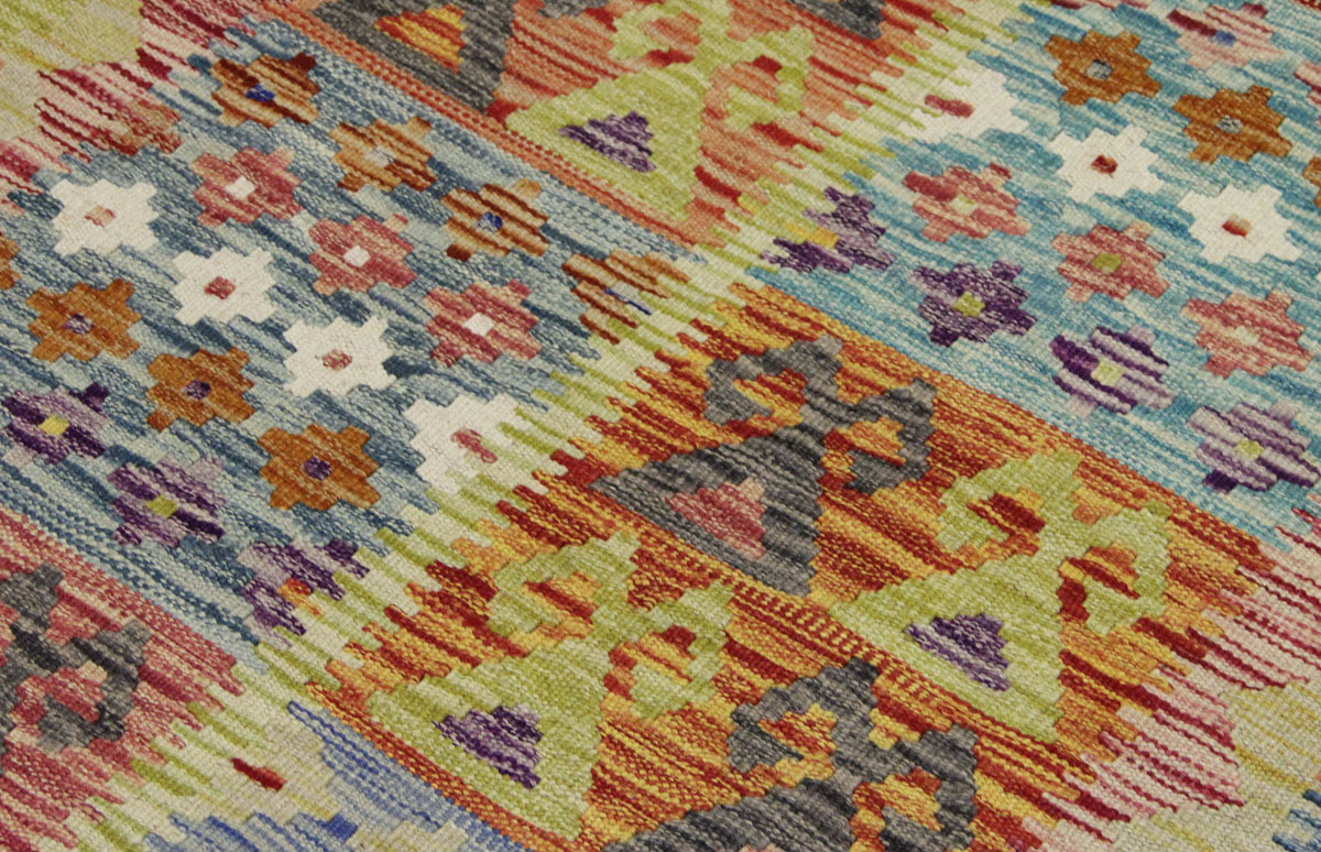 Motivi uključuju geometrijske oblike, stilizirane cvjetne elemente i povijesne ornamentalne uzorke koji su stoljećima prisutni u afganistanskoj tradiciji izrade tepiha. Zahvaljujući bogatoj ornamentici i skladnom rasporedu motiva, ovaj kelim predstavlja dekorativan element koji se lako uklapa u različite tipove interijera.
