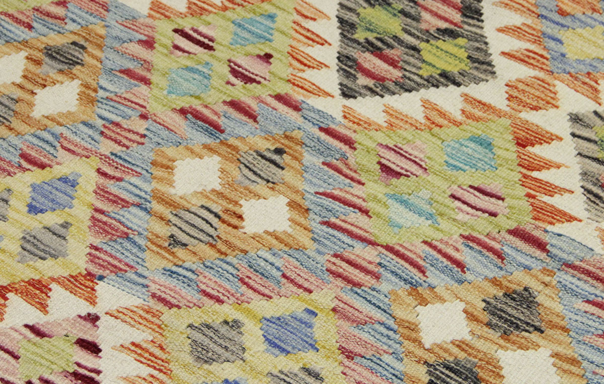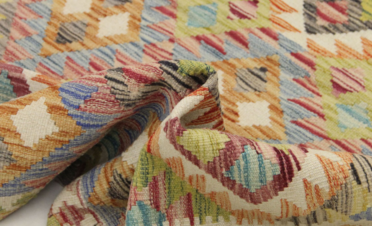 Motivi uključuju geometrijske oblike, stilizirane cvjetne elemente i povijesne ornamentalne uzorke koji su stoljećima prisutni u afganistanskoj tradiciji izrade tepiha. Zahvaljujući bogatoj ornamentici i skladnom rasporedu motiva, ovaj kelim predstavlja dekorativan element koji se lako uklapa u različite tipove interijera.