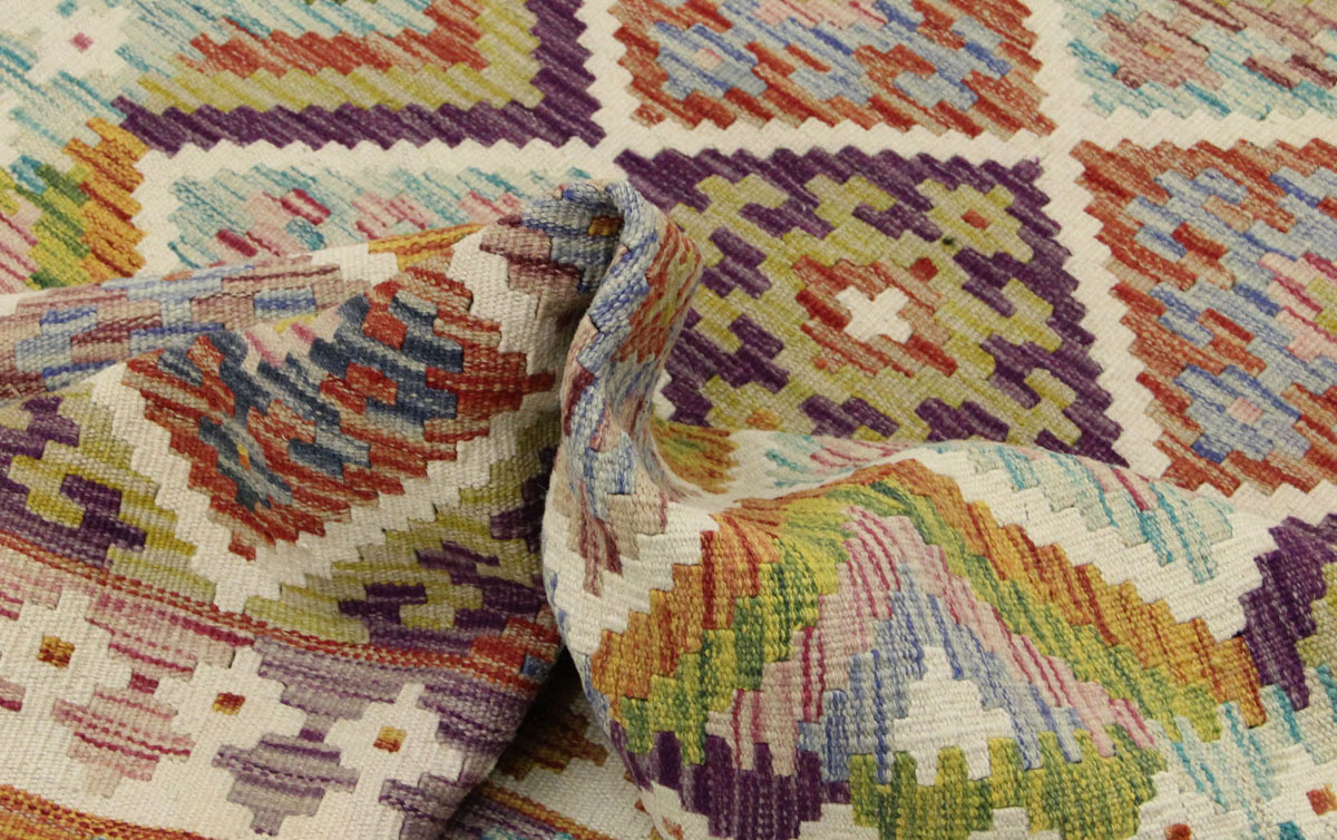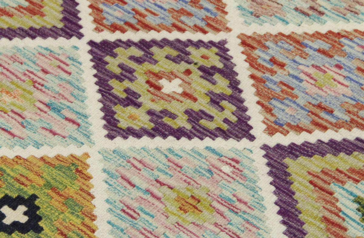 Motivi uključuju geometrijske oblike, stilizirane cvjetne elemente i povijesne ornamentalne uzorke koji su stoljećima prisutni u afganistanskoj tradiciji izrade tepiha. Zahvaljujući bogatoj ornamentici i skladnom rasporedu motiva, ovaj kelim predstavlja dekorativan element koji se lako uklapa u različite tipove interijera.
