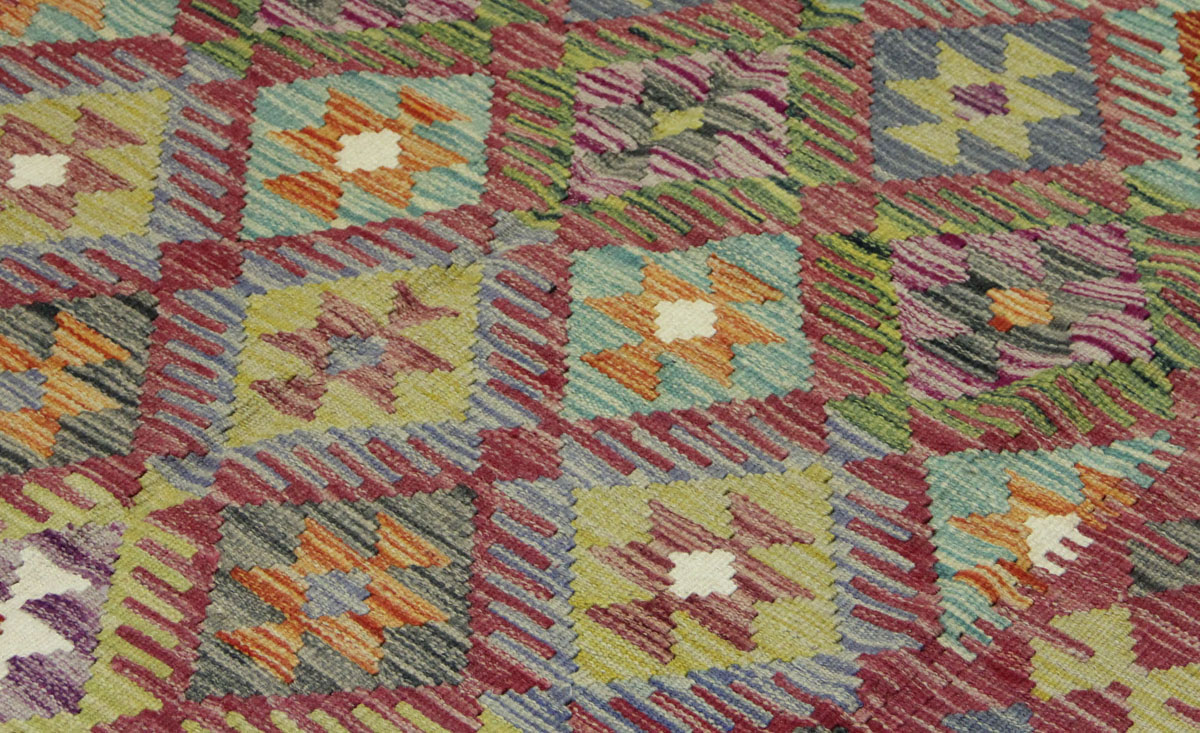 Motivi uključuju geometrijske oblike, stilizirane cvjetne elemente i povijesne ornamentalne uzorke koji su stoljećima prisutni u afganistanskoj tradiciji izrade tepiha. Zahvaljujući bogatoj ornamentici i skladnom rasporedu motiva, ovaj kelim predstavlja dekorativan element koji se lako uklapa u različite tipove interijera.