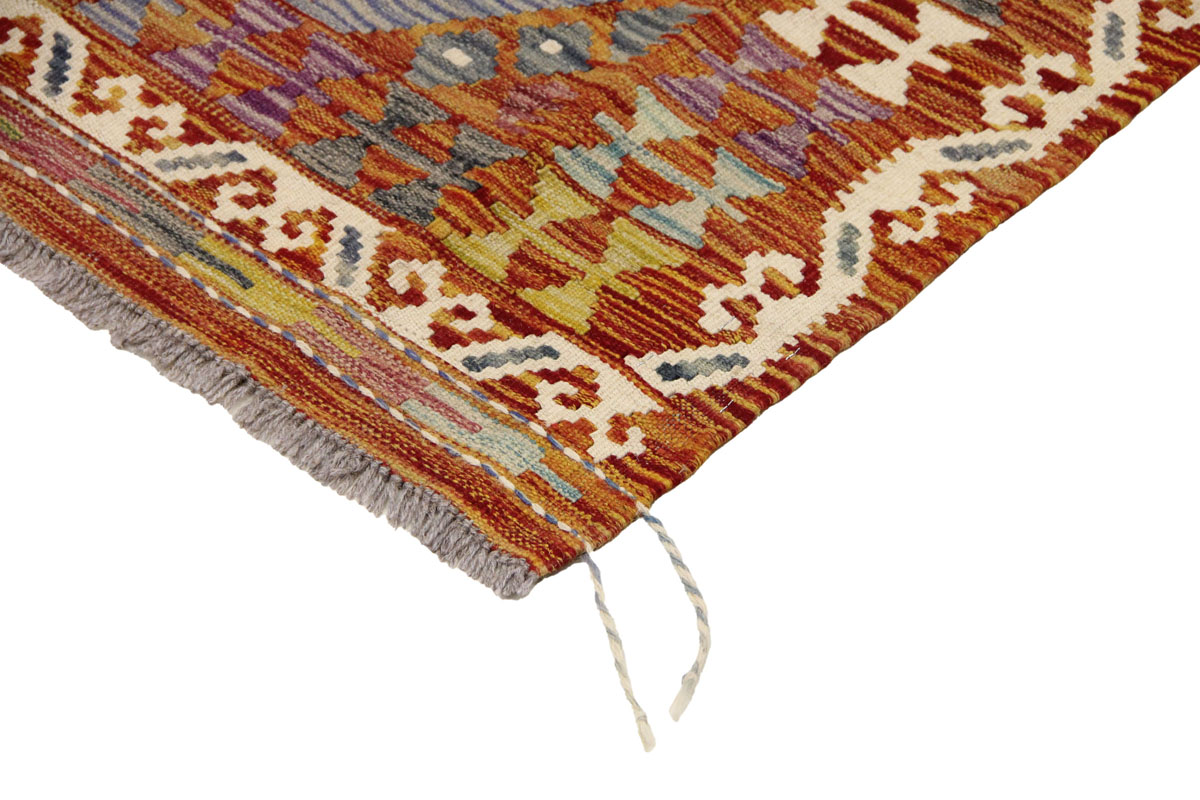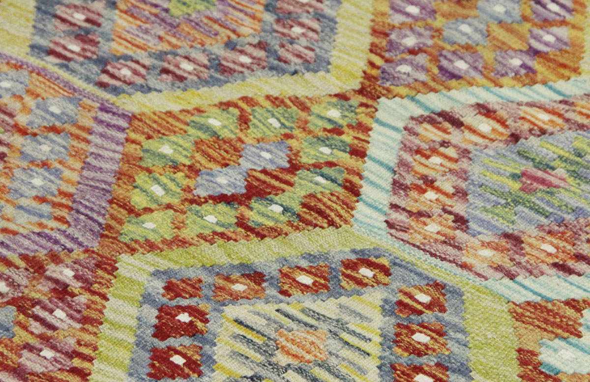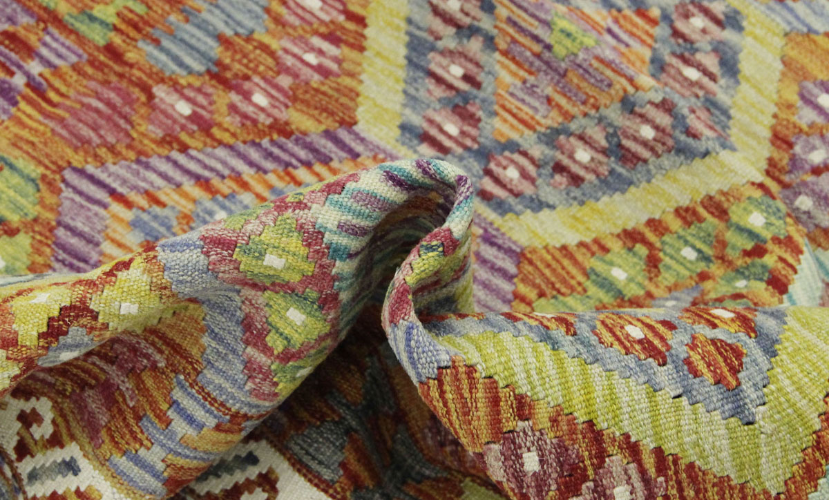 Motivi uključuju geometrijske oblike, stilizirane cvjetne elemente i povijesne ornamentalne uzorke koji su stoljećima prisutni u afganistanskoj tradiciji izrade tepiha. Zahvaljujući bogatoj ornamentici i skladnom rasporedu motiva, ovaj kelim predstavlja dekorativan element koji se lako uklapa u različite tipove interijera.