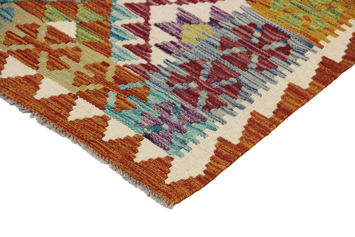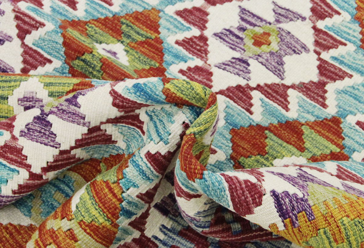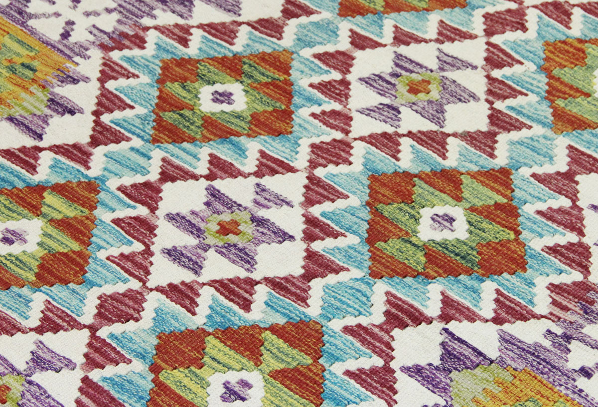Motivi uključuju geometrijske oblike, stilizirane cvjetne elemente i povijesne ornamentalne uzorke koji su stoljećima prisutni u afganistanskoj tradiciji izrade tepiha. Zahvaljujući bogatoj ornamentici i skladnom rasporedu motiva, ovaj kelim predstavlja dekorativan element koji se lako uklapa u različite tipove interijera.