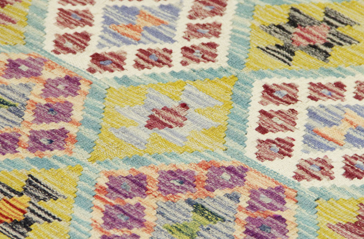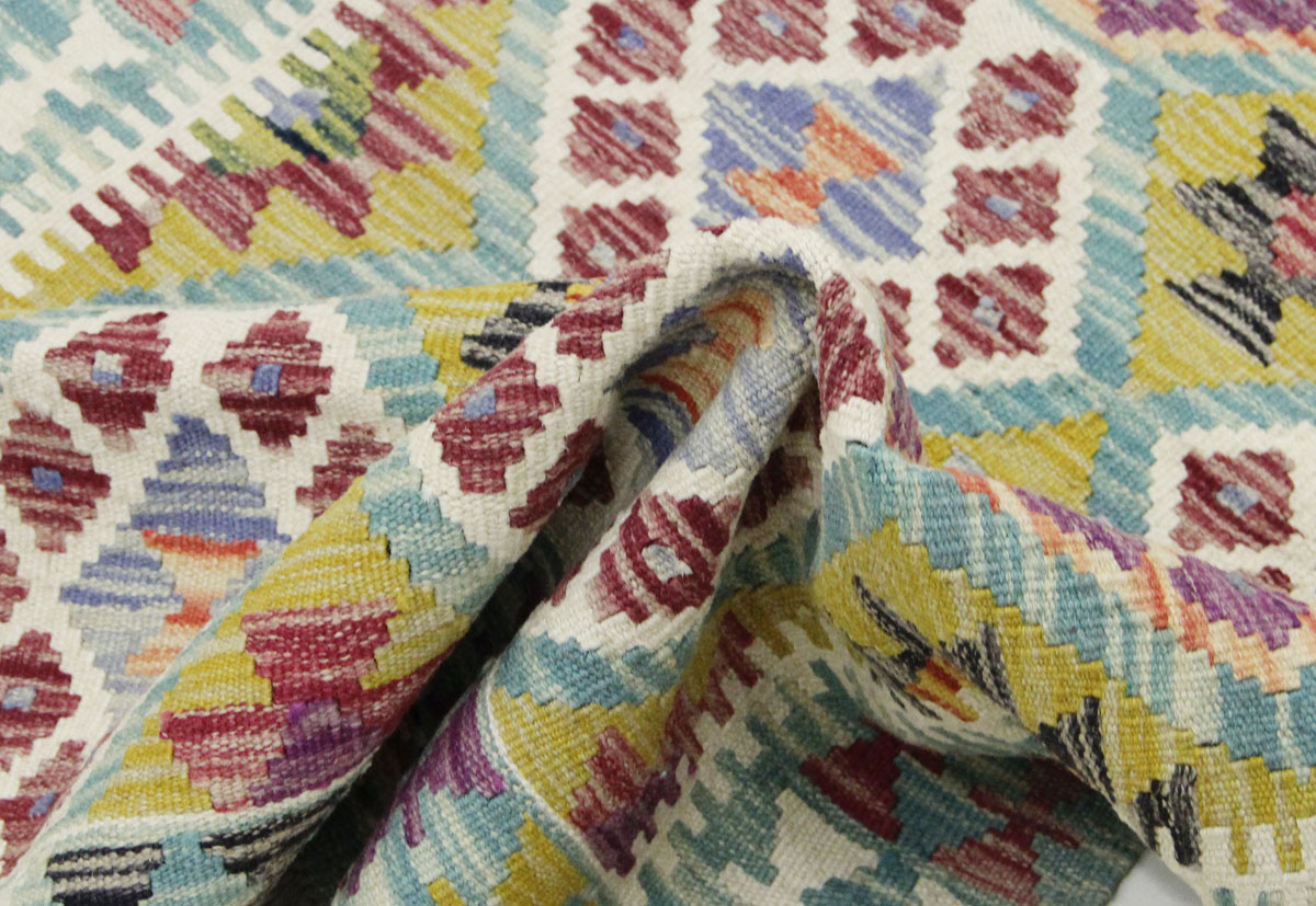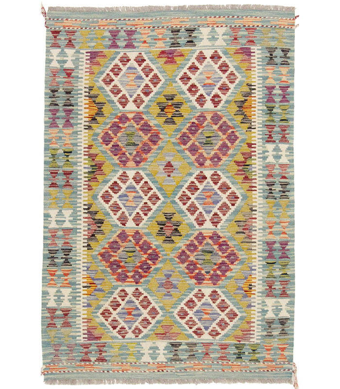 Motivi uključuju geometrijske oblike, stilizirane cvjetne elemente i povijesne ornamentalne uzorke koji su stoljećima prisutni u afganistanskoj tradiciji izrade tepiha. Zahvaljujući bogatoj ornamentici i skladnom rasporedu motiva, ovaj kelim predstavlja dekorativan element koji se lako uklapa u različite tipove interijera.