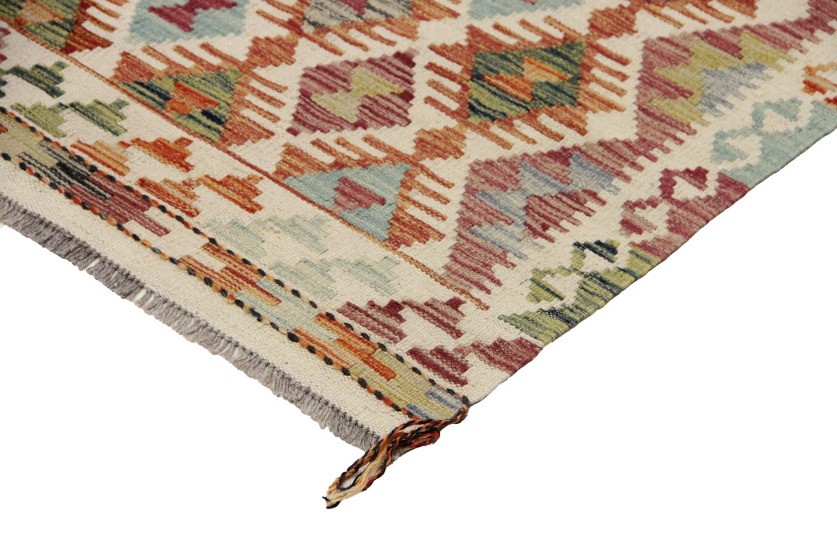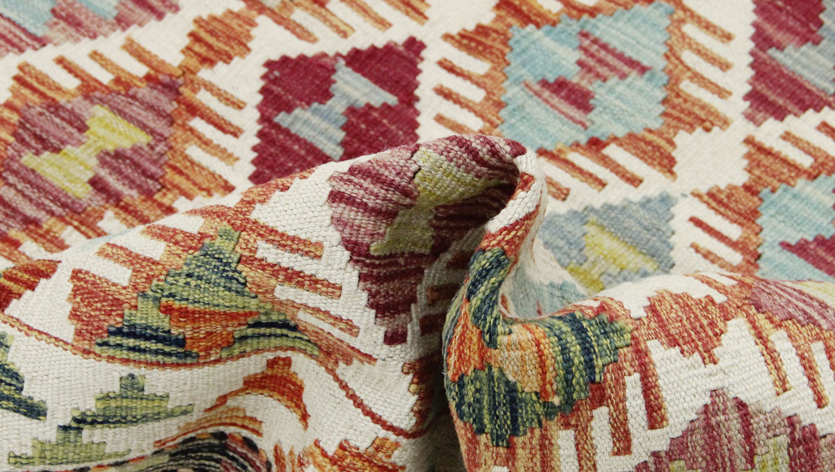 Motivi uključuju geometrijske oblike, stilizirane cvjetne elemente i povijesne ornamentalne uzorke koji su stoljećima prisutni u afganistanskoj tradiciji izrade tepiha. Zahvaljujući bogatoj ornamentici i skladnom rasporedu motiva, ovaj kelim predstavlja dekorativan element koji se lako uklapa u različite tipove interijera.