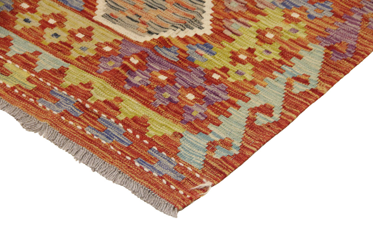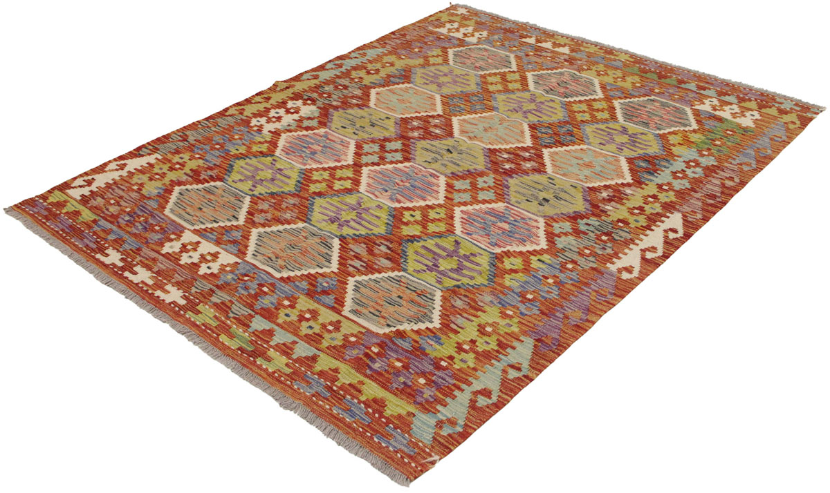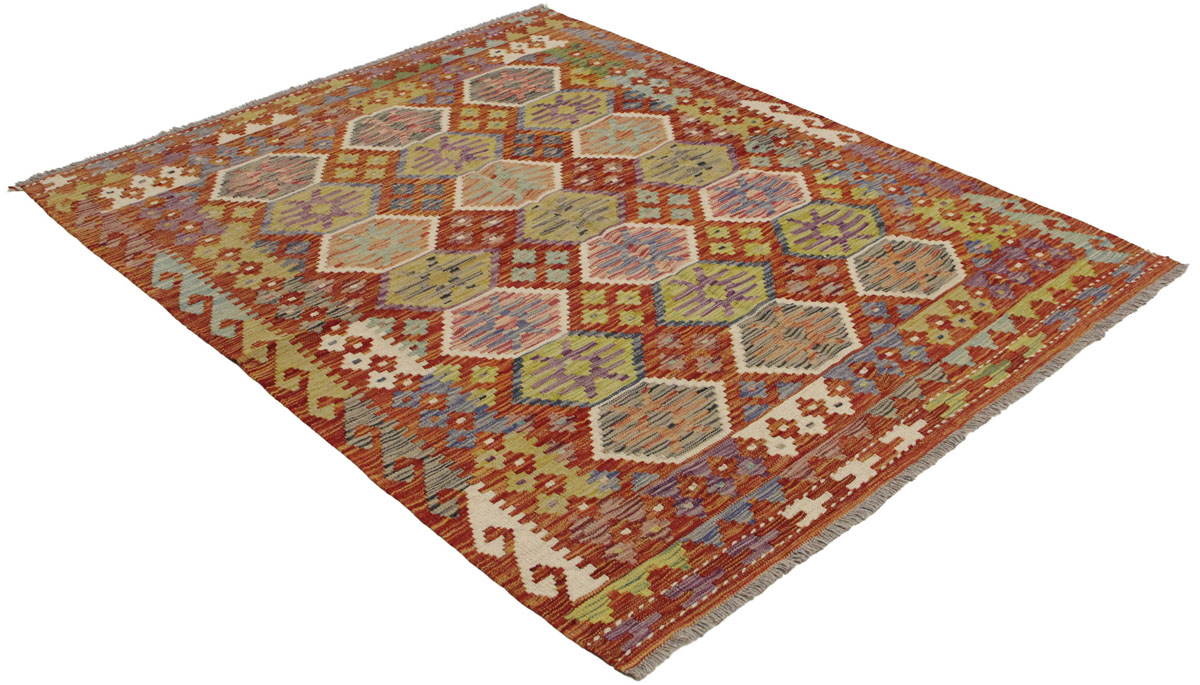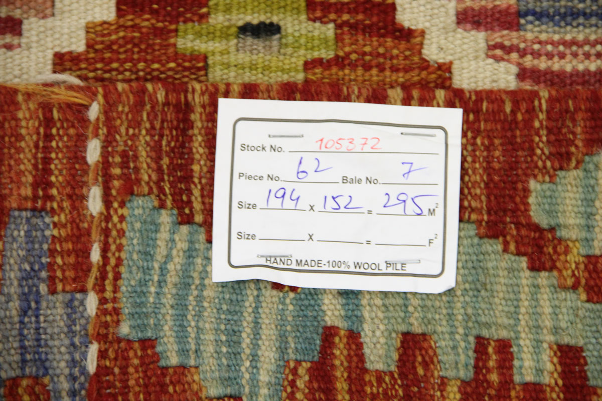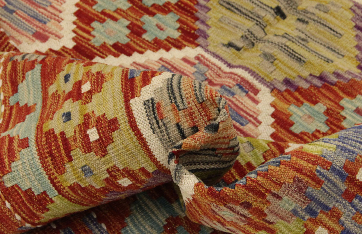 Kelim je izrađen tradicionalnom tehnikom tkanja na tkalačkom stanu, koristeći prirodne materijale poput vune i pamuka, koji se potom boje kako bi se postigla bogata i skladna paleta tonova. Takvi kelimi dio su dugogodišnje tekstilne tradicije Afganistana i poznati su po svojoj izdržljivosti, jednostavnoj strukturi i dekorativnoj snazi uzorka.