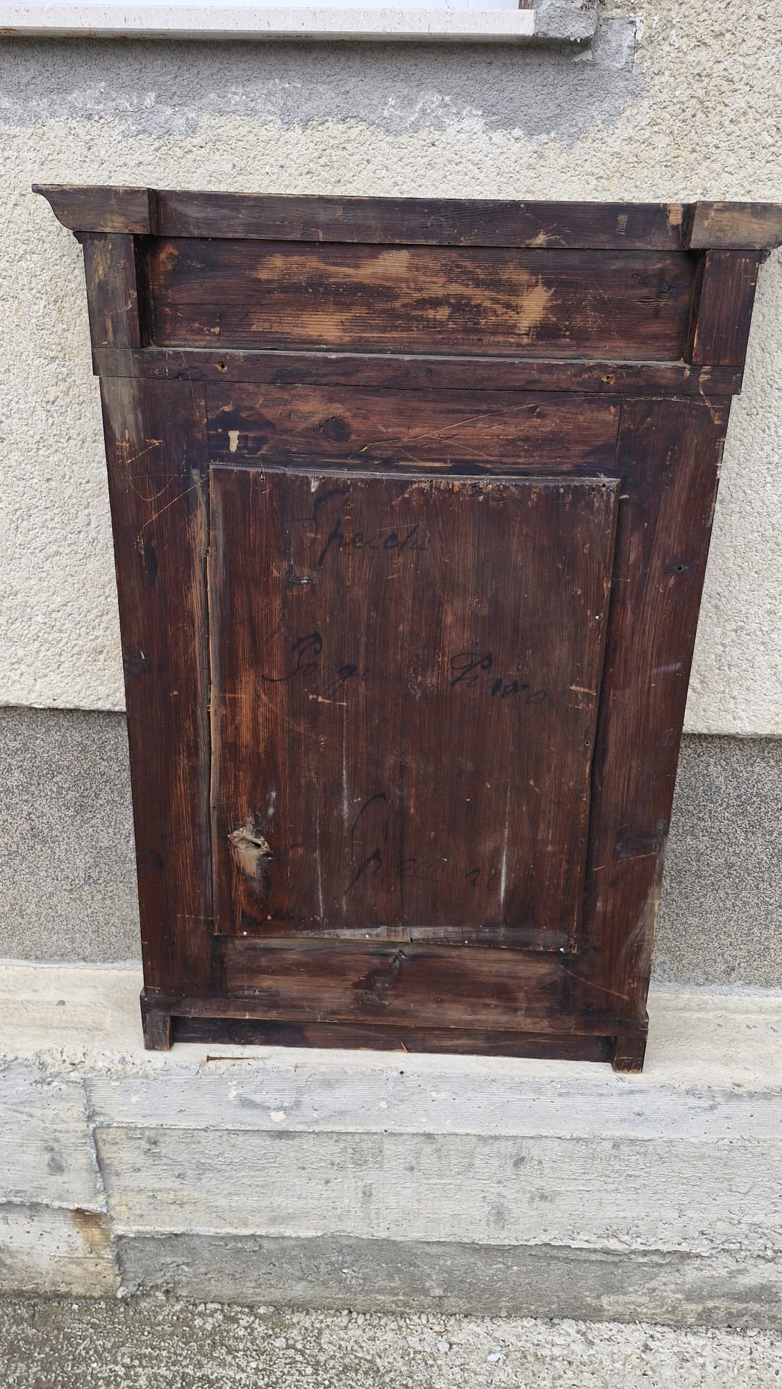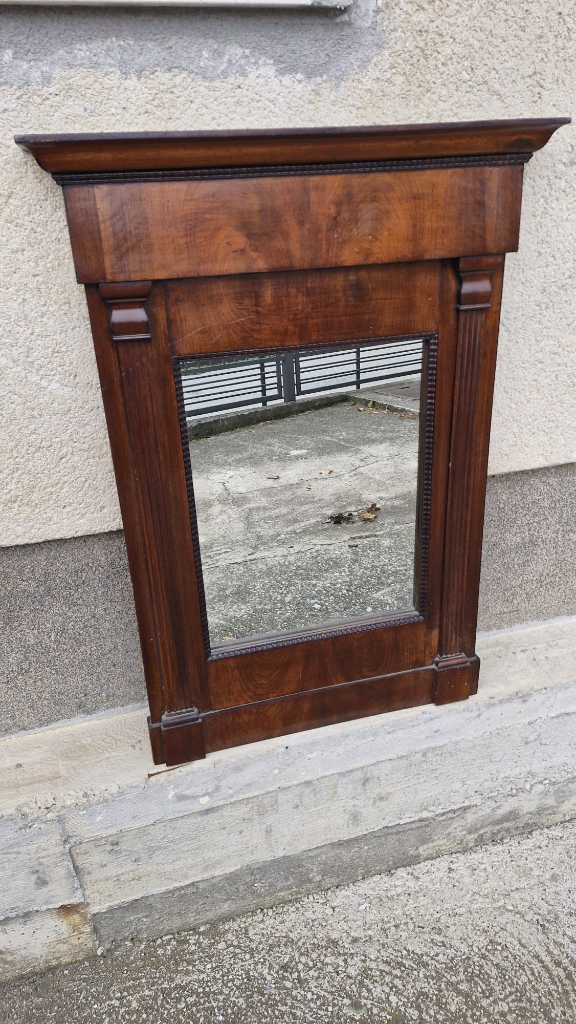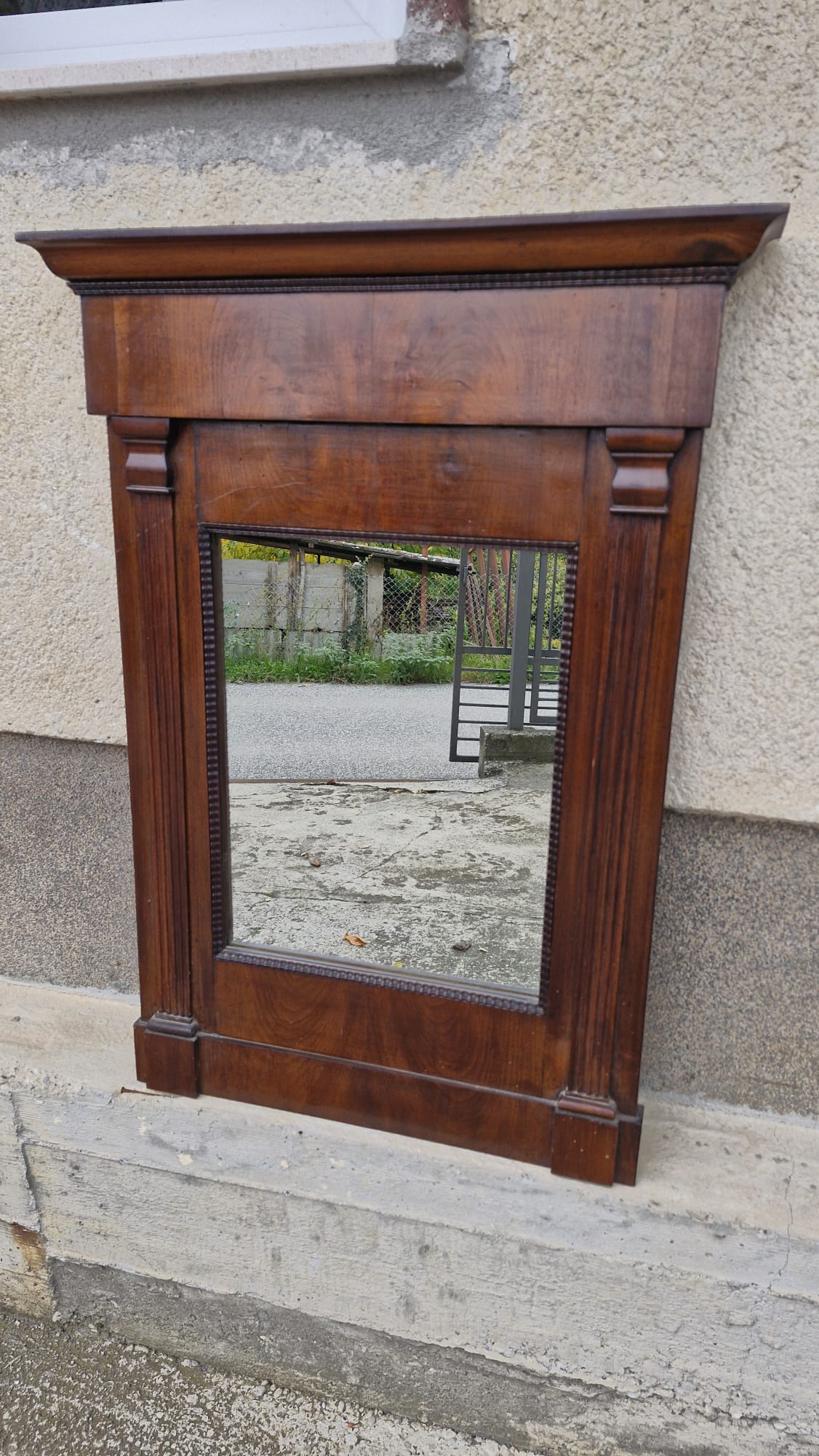Elegantno zidno ogledalo iz prve polovice 19. stoljeća, izrađeno u mješavini stilova Bidermajera, Klasicizma i Alt deutscha. Okvir je furniran profinjenim orahovim furnirom bogate strukture. Karakteristični elementi uključuju arhitektonsku kompoziciju s kaneliranim stupićima, vijenac i decentnu dekoraciju, a ogledalo odiše klasičnom elegancijom tog razdoblja. Vrhunski primjerak zidnog ogledala s povijesnim karakterom, restaurirano s pažnjom na očuvanje izvorne patine.
