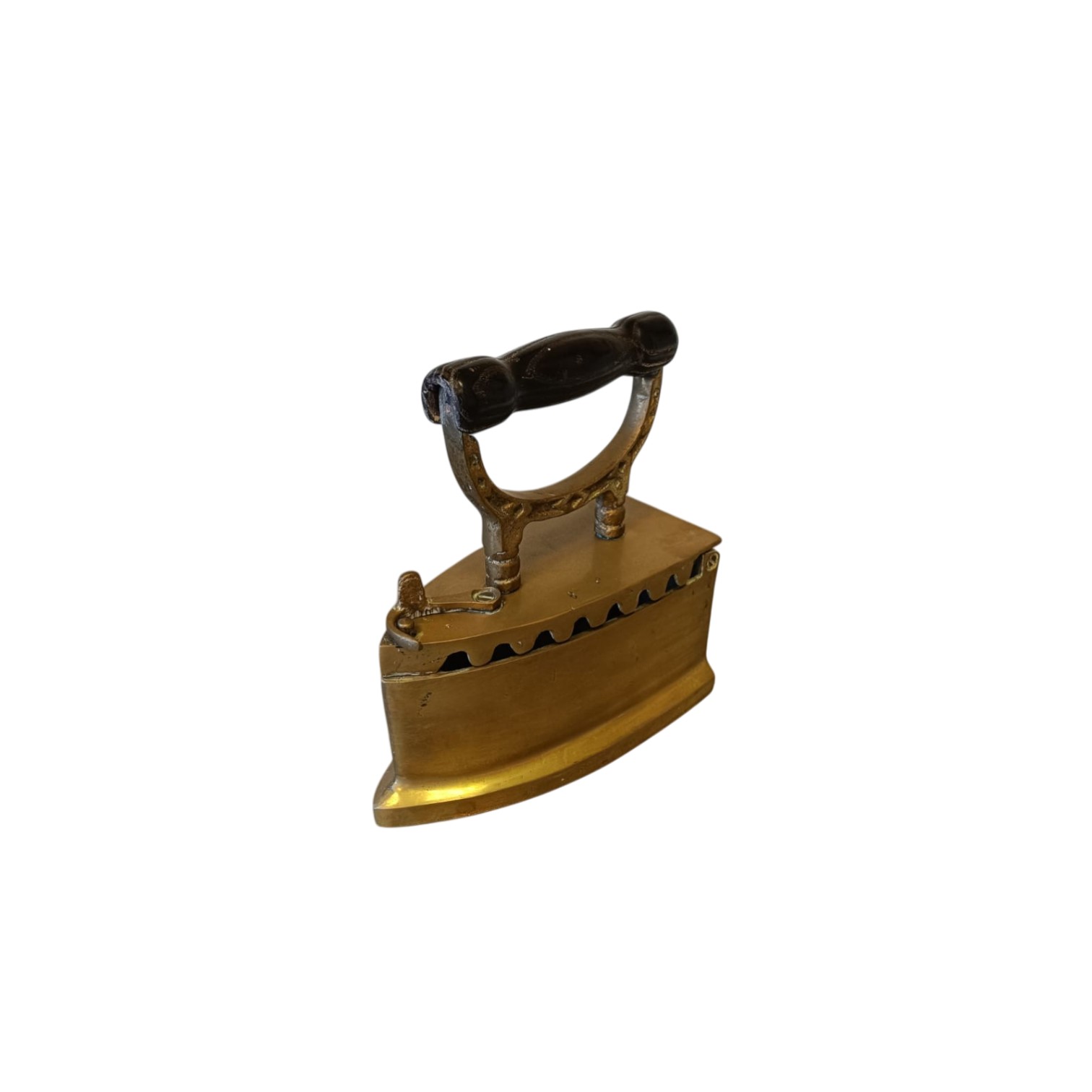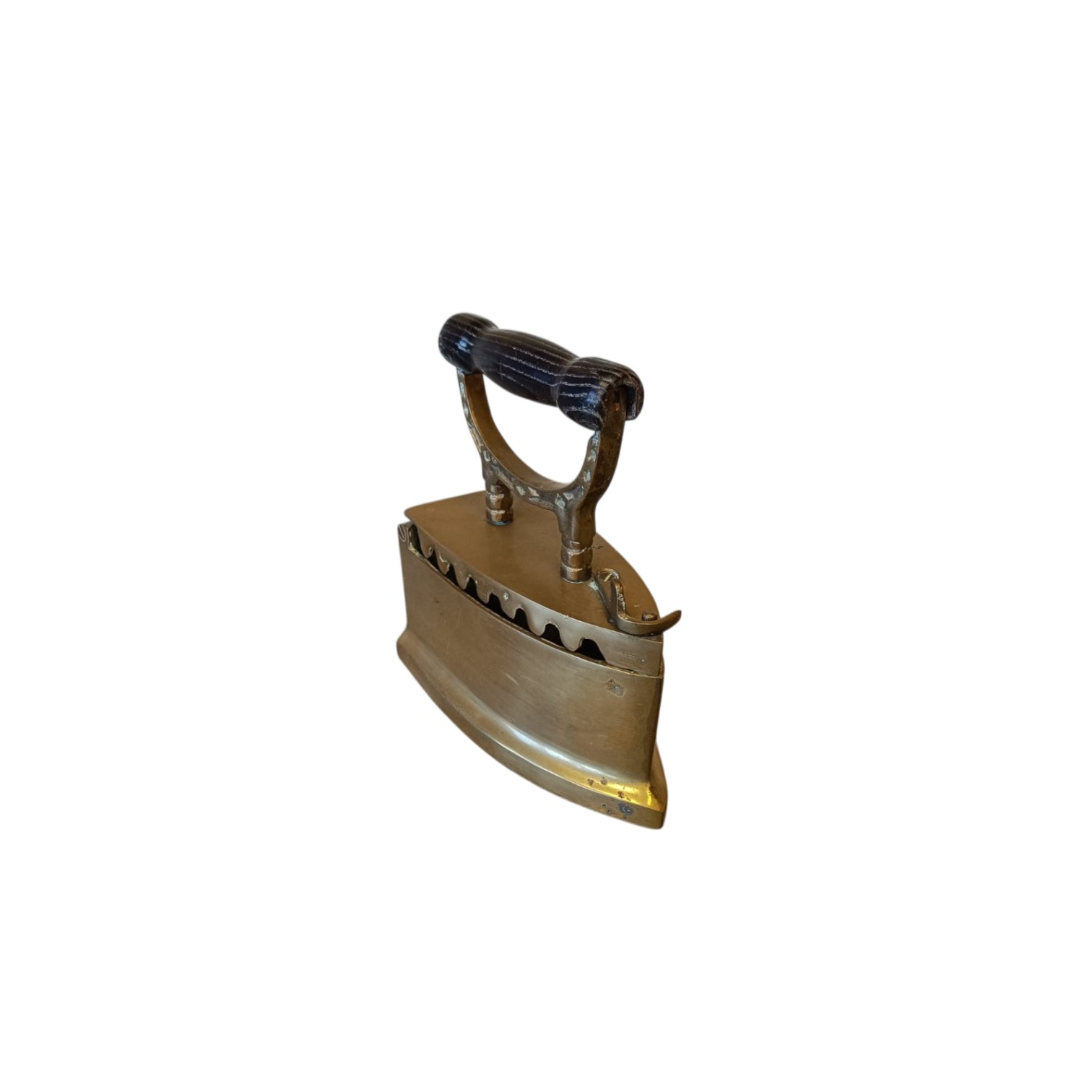 Antikna putna pegla na žar izrađena od mesinga, s profiliranom drvenom drškom i preklopnim poklopcem. Datira s kraja 19. stoljeća i predstavlja karakterističan primjer prijenosnih glačala korištenih prije uvođenja električne energije.