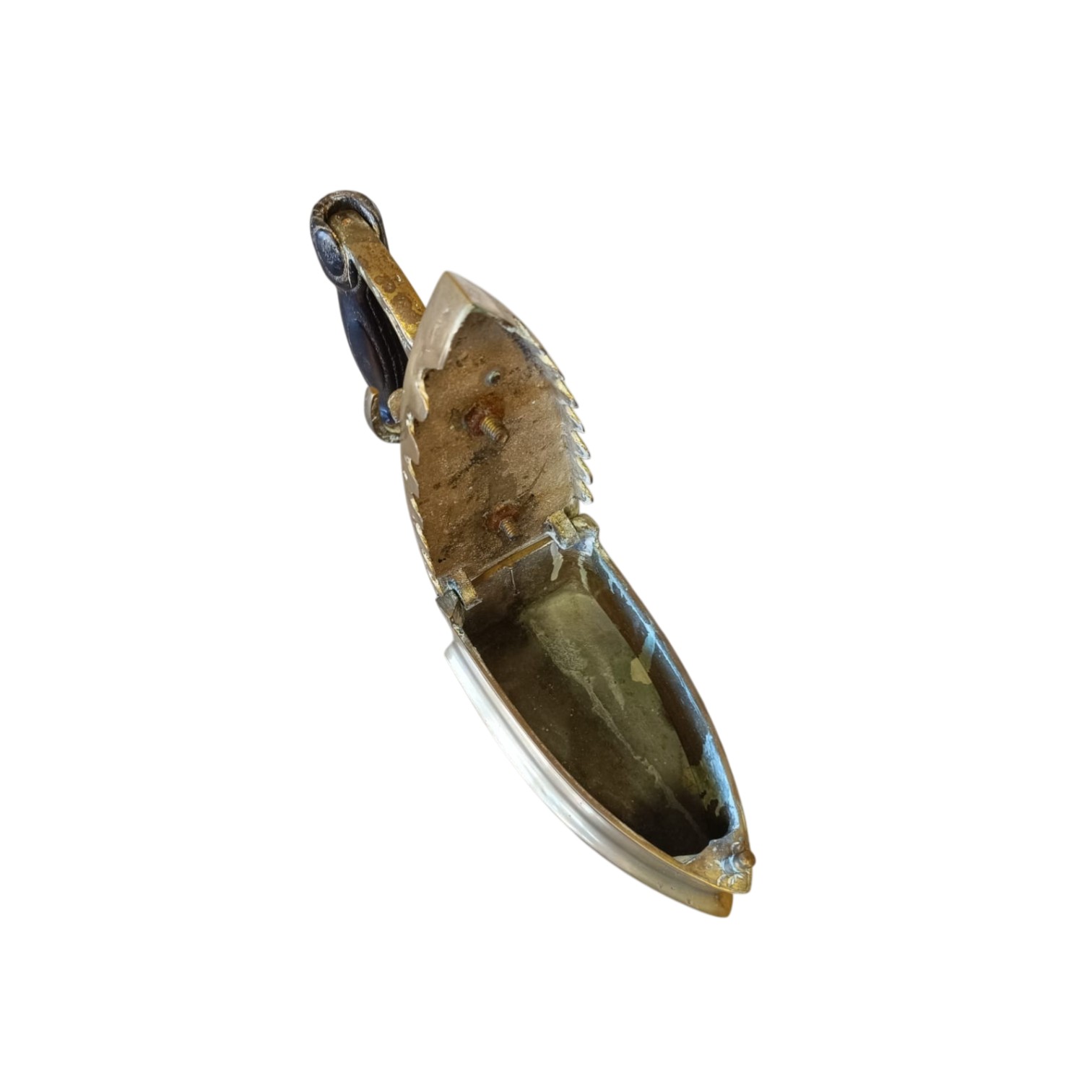 Unutrašnjost je predviđena za umetanje užarenog ugljena, dok otvori uz rub omogućuju ventilaciju i ravnomjernu raspodjelu topline. Bočna poluga služi za otvaranje poklopca, a valoviti rub dodatno naglašava funkcionalni, ali i estetski oblik predmeta.