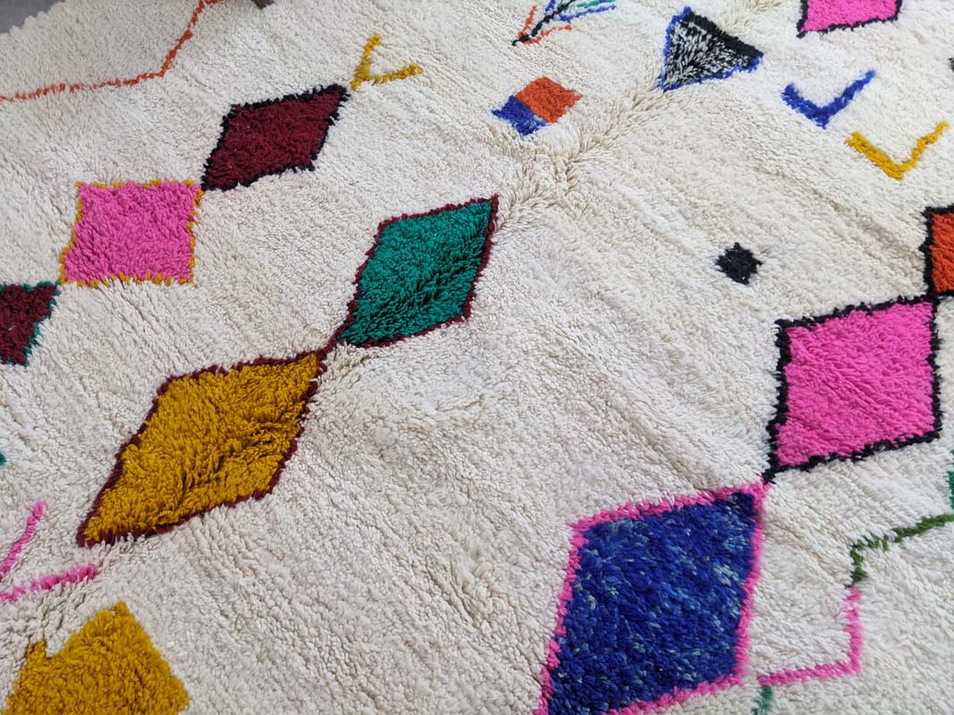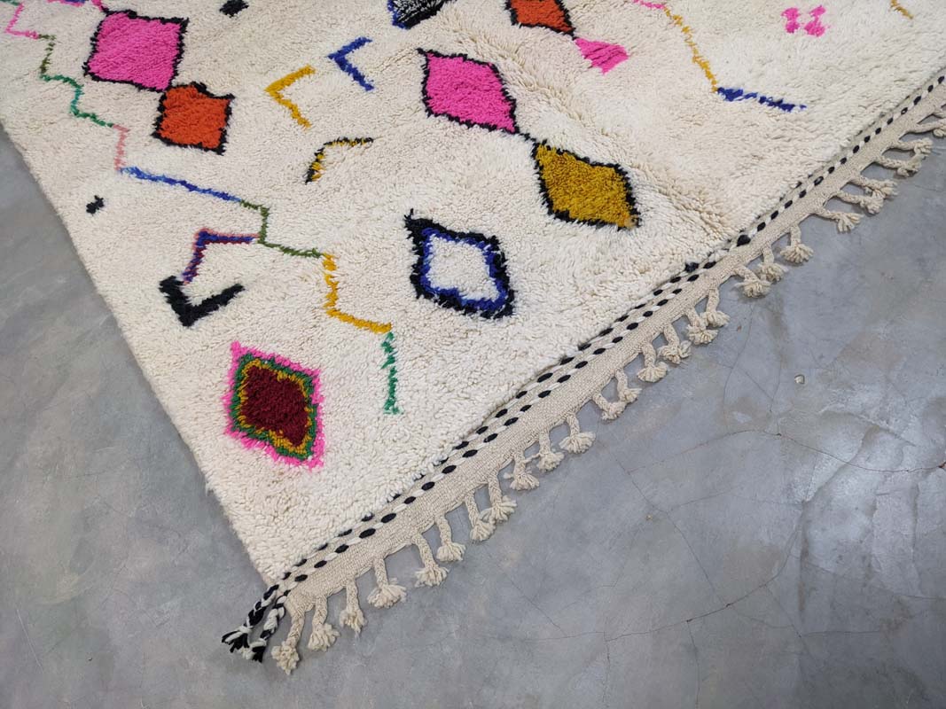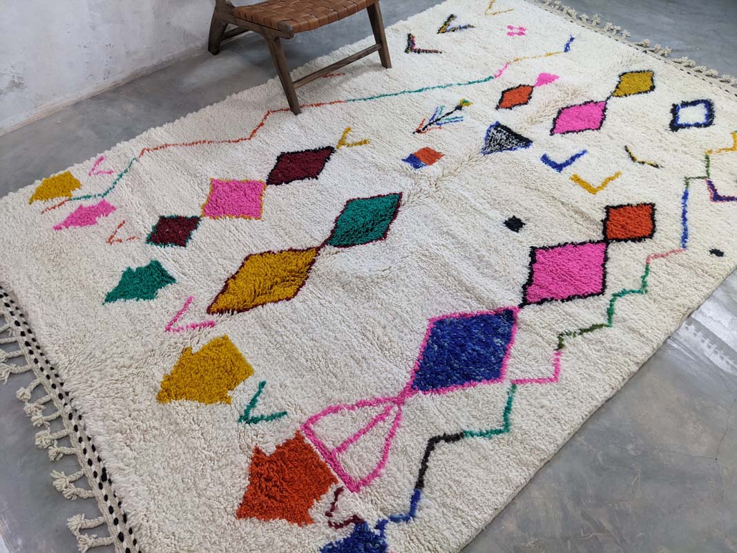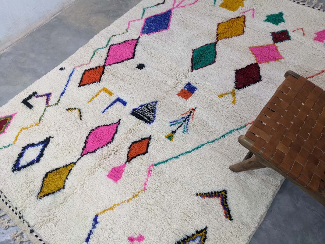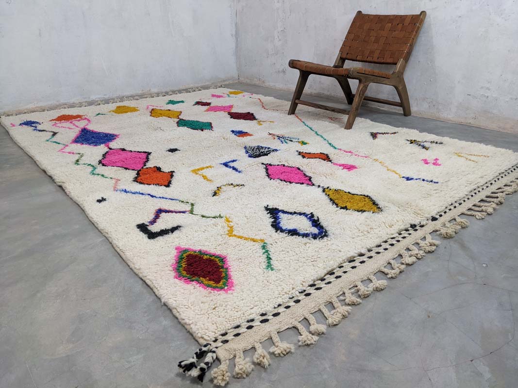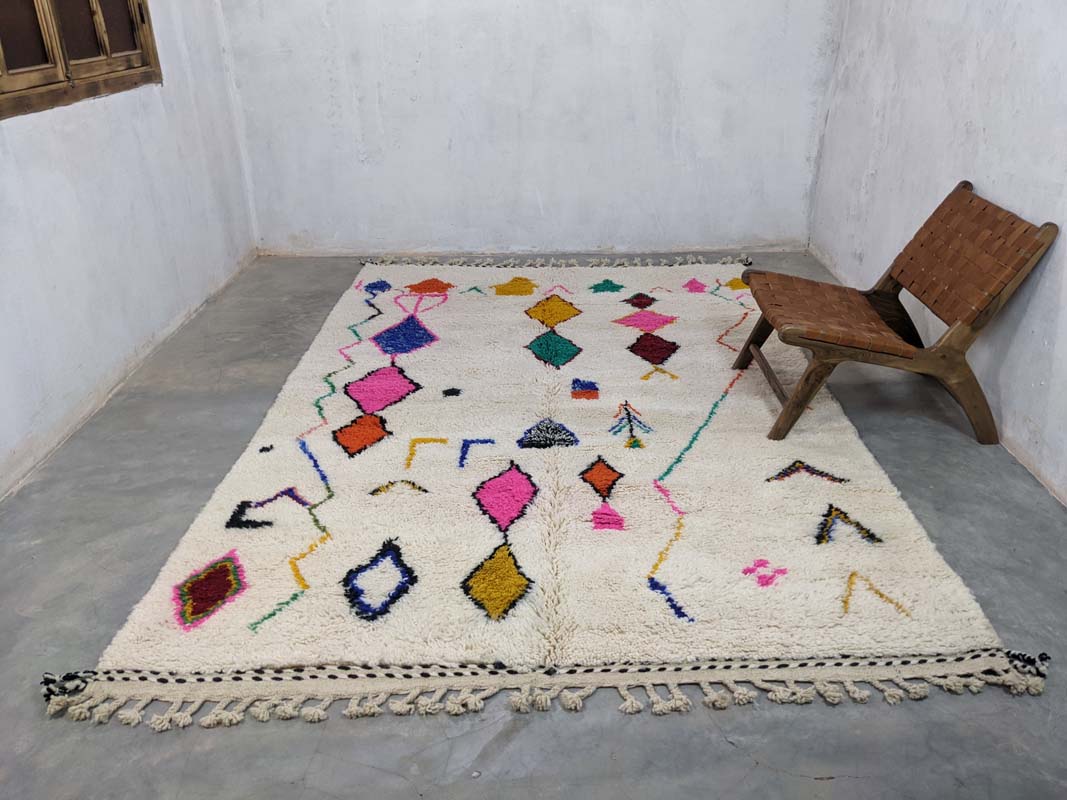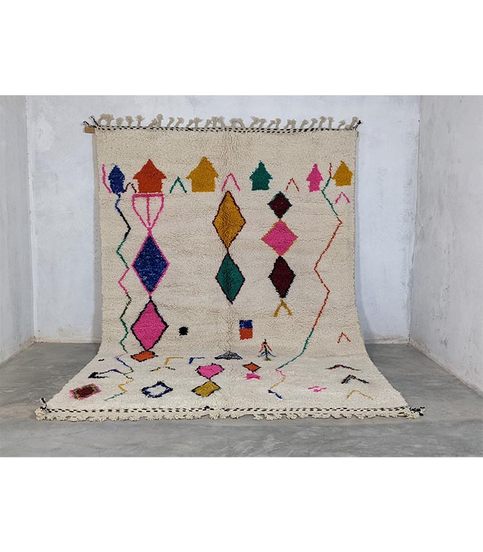 Ovaj originalni berberski tepih unosi toplinu, stil i dašak marokanske tradicije u vaš dom. Svaki tepih ručno je izrađen u Maroku od mekane, visokokvalitetne nove vune, što ga čini neponovljivim unikatnim djelom. Njegov moderan geometrijski uzorak s boho-etno karakterom savršeno se uklapa u razne stilove interijera – od skandinavskog i mid-century do boho-chic estetike. Sklad boja i uzoraka čini ga upečatljivim detaljem u svakoj prostoriji – bilo da ga postavite u dnevnu sobu, spavaću sobu ili hodnik.