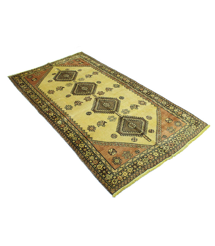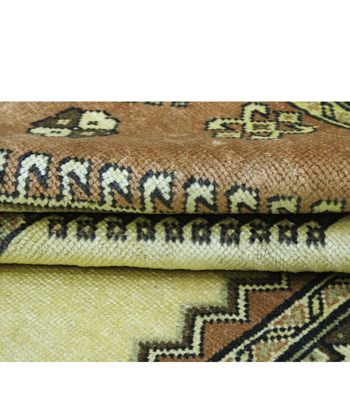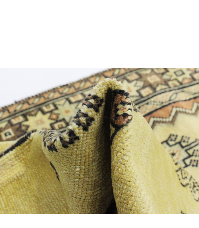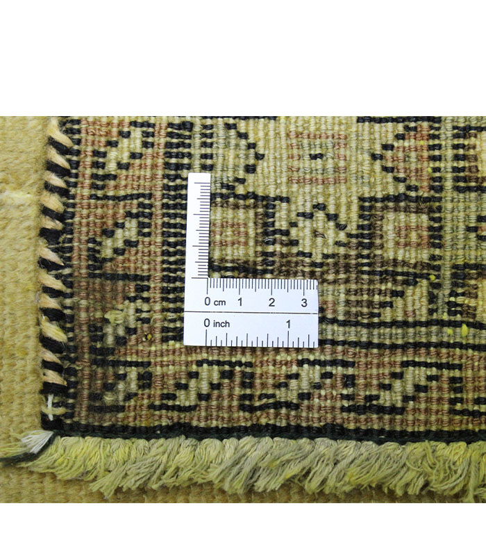 Ova ekskluzivna zlatna boja postignuta je korištenjem prirodnih biljnih i mineralnih pigmenata ili suvremenim tehnikama bojanja koje dodatno ističu sjaj i trajnost tepiha. Precizna ručna izrada naglašava simetriju uzoraka i finu detaljnost, čineći ovaj tepih pravim umjetničkim djelom.