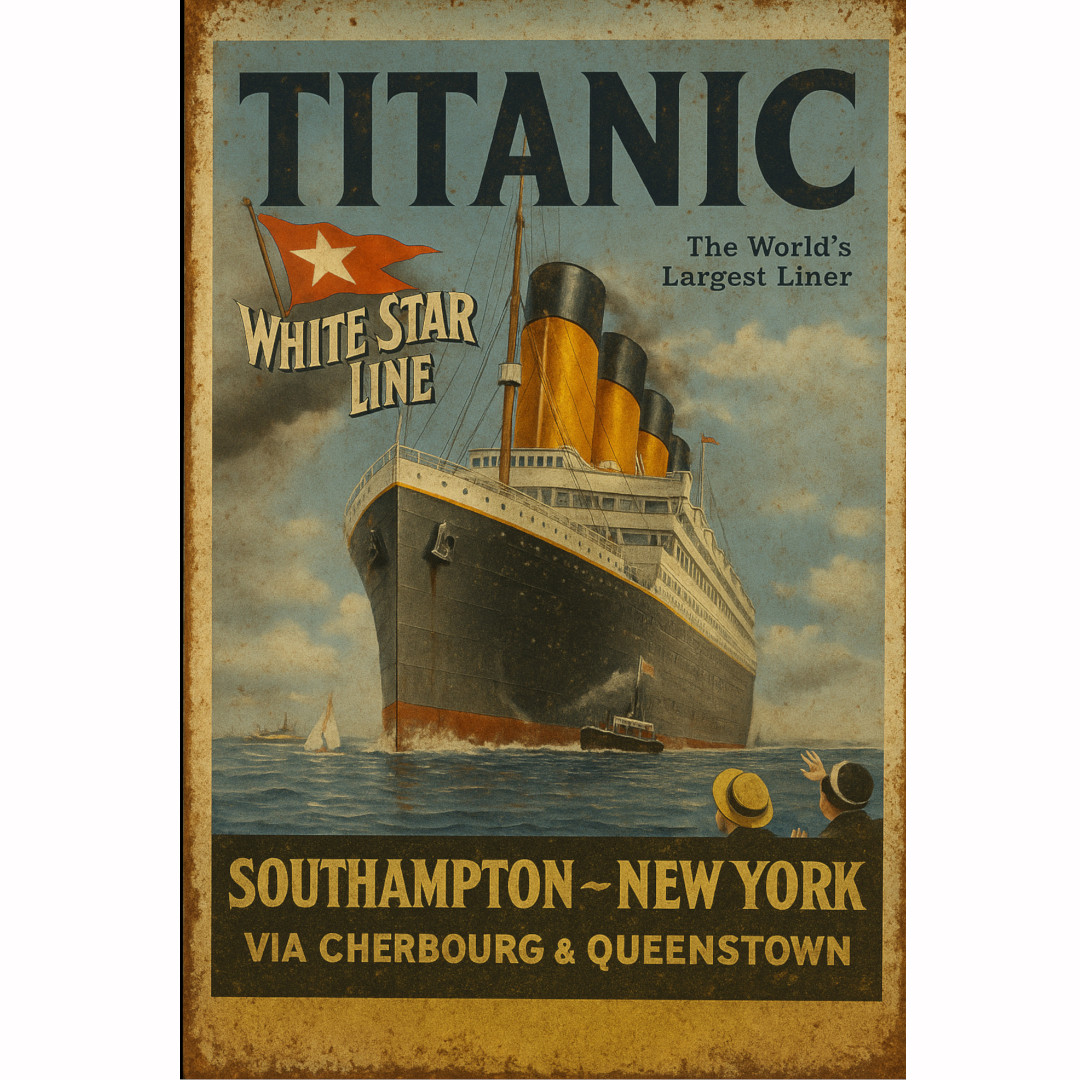 Dekorativna metalna reklama s prikazom legendarnog broda Titanic. Stilizirani originalni promotivni plakat linije White Star Line prikazuje brod u punom zamahu na putu iz Southamptona prema New Yorku. Izrađeno tehnikom UV tiska na aluminijskoj kompozitnoj ploči dimenzija 40 × 27 cm. Autentičan dodatak za kolekcionare, ugostiteljske prostore ili ljubitelje pomorske povijesti.